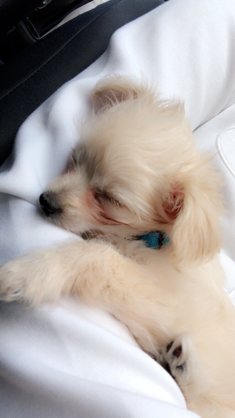 Sen kom Elliot förbi med Sally. En 9 veckors valp. Han var hundvakt medan hans kompis jobbade. En blandning mellan chihuahua och dvärgpudel är hon. Ämen jag svimmade av. Jag grät när jag såg henne första gången. Ögonen tårades och hjärtat älskade henne från första stund. Jag orkar inte – fattar inte hur kär jag kan bli i djur alltså?