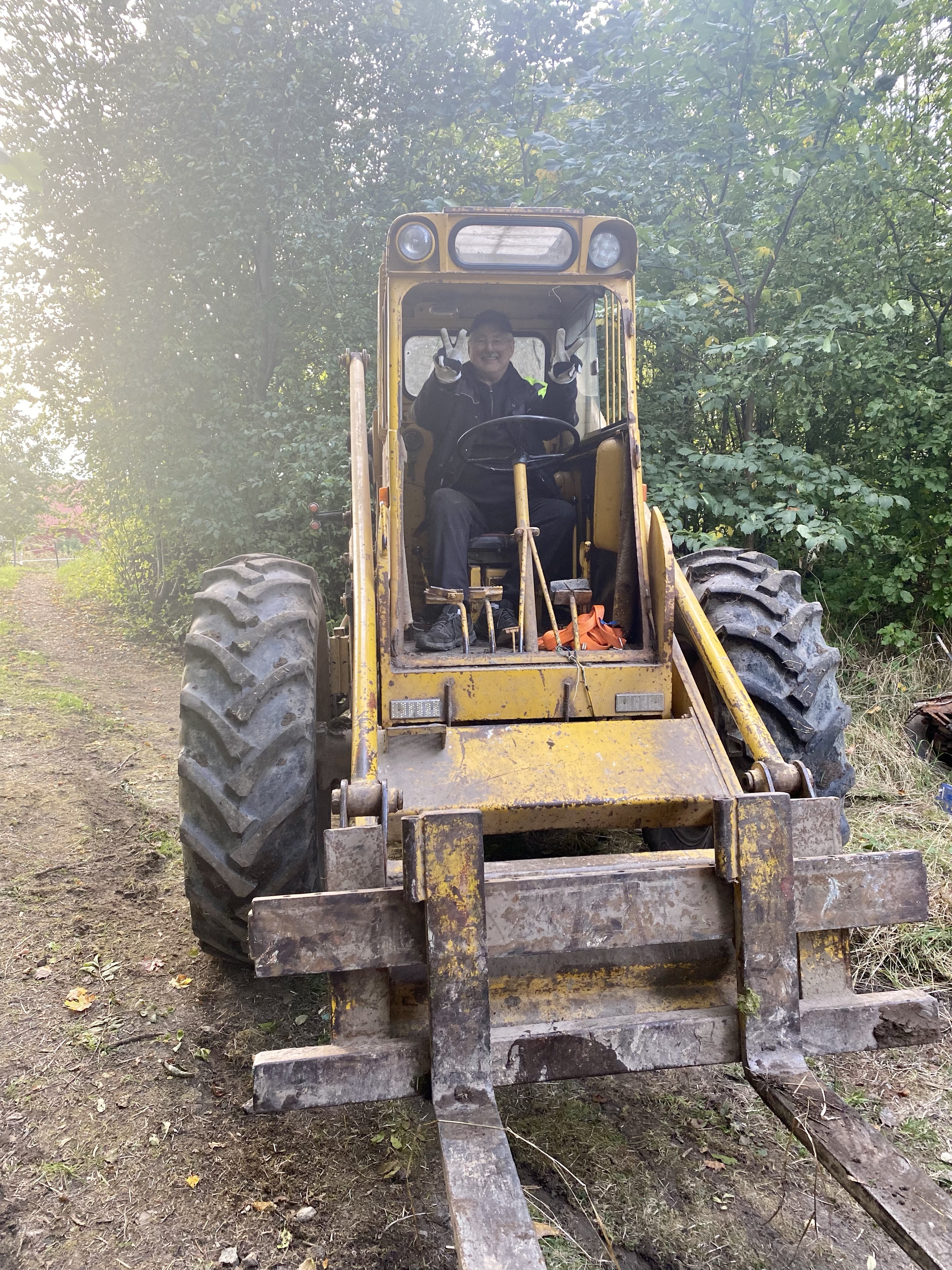 Väl därute så fick vi se en väldigt nöjd svärfar som fick husera runt med den här hjullastaren. Intill deras gård finns en till gård som numera är Tonys brors. Där håller de nu på att röja undan massa bilar som stått och samlat på sig mossa. Japp, du läste rätt. Mossa växer på bilarna, så du kan ju tänka dig hur länge de stått!