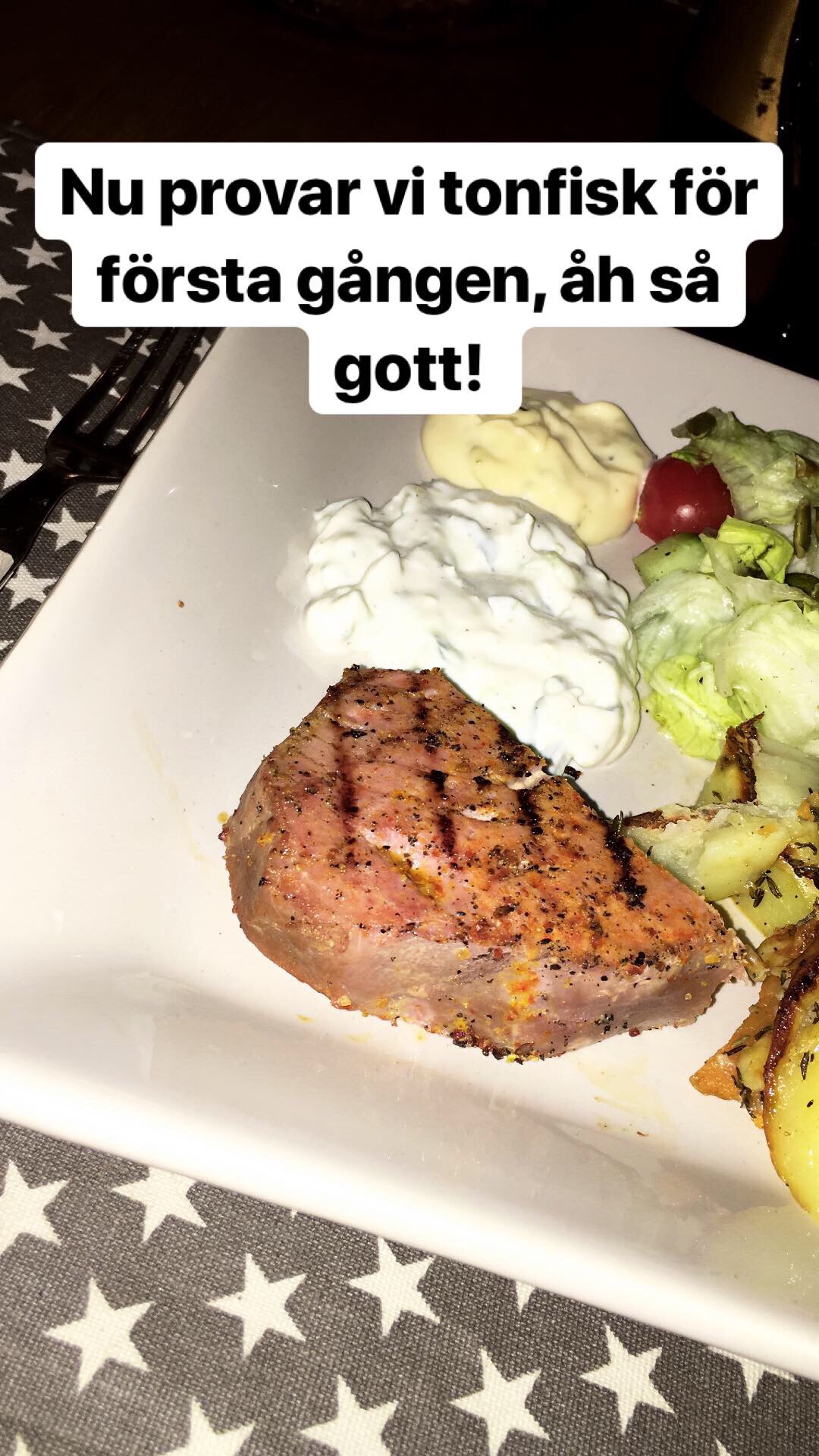Efter AW hos oss blev vi bjudna hem till dom på lite mat till Lets Dance. Det bjöds på oxfilé, tonfisk, en härlig rostning av potatis, sötpotatis och morötter och så såser till.