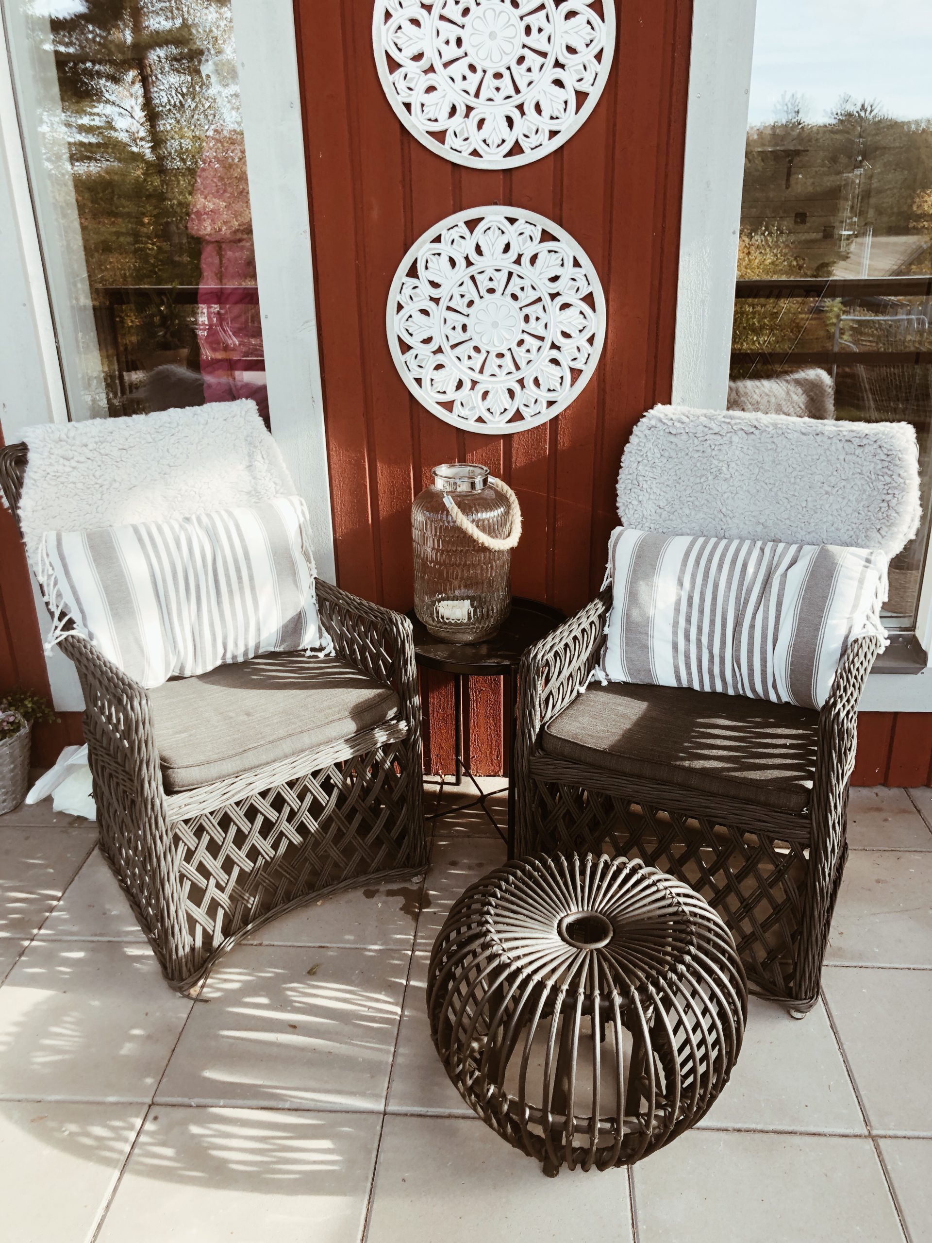 Efter en hel del fix och några timmars jobb så blev det till slut himla mysigt. Här gjorde jag en liten sittgrupp som man kan sitta och njuta av höstsolen på. Med en kopp te. Tända ljuset i lyktan och sånt. Ska VERKLIGEN försöka njuta och sitta här i höst, detta är under tak så man behöver inte tänka på dynor och sånt om det regnar.