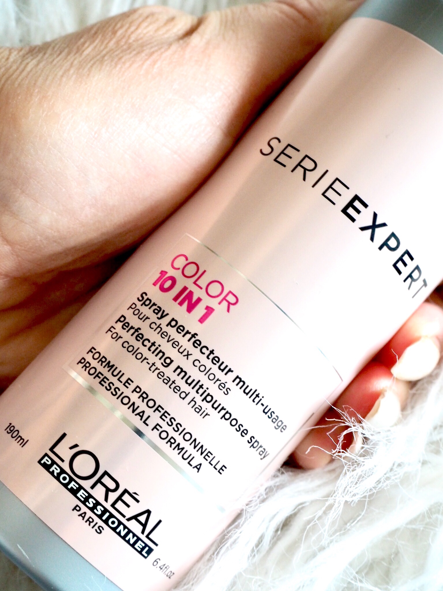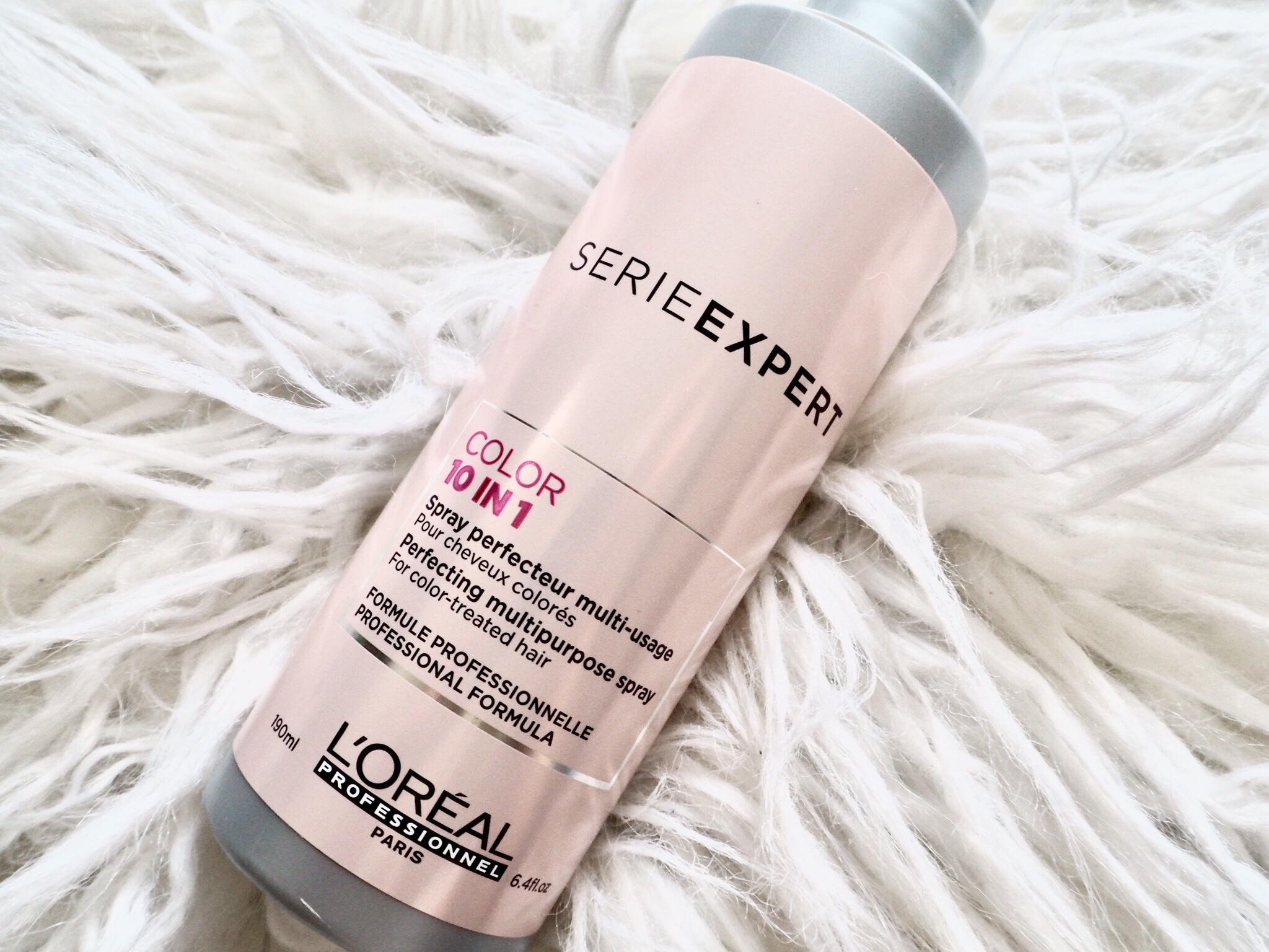 Den här produkten, Loreal serie expert 10 in 1, är en spray som du kan ha i både vått och torrt hår. Det är en beskyddande spray till färgat hår. Sprayen har inte mindre än 10 egenskaper: