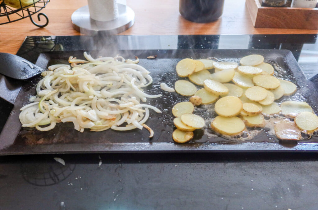 Jag stekte både löken och potatisen på mitt stekbord (<klicka för produkt) – jag har den stora på 45 cm. Finns även mindre. Älskar det där stekbordet. Får plats med så mycket på det, perfekt att använda både på induktionshäll, vanlig häll, eld eller grill.