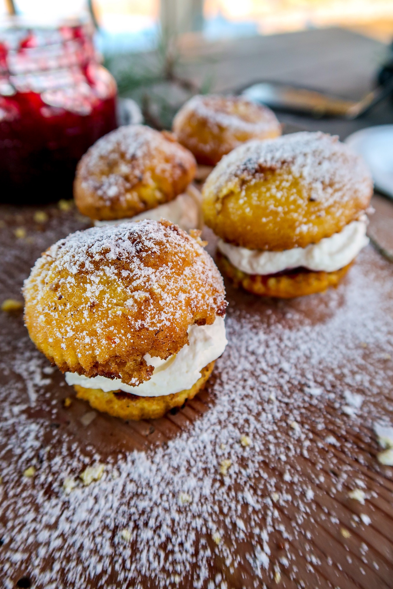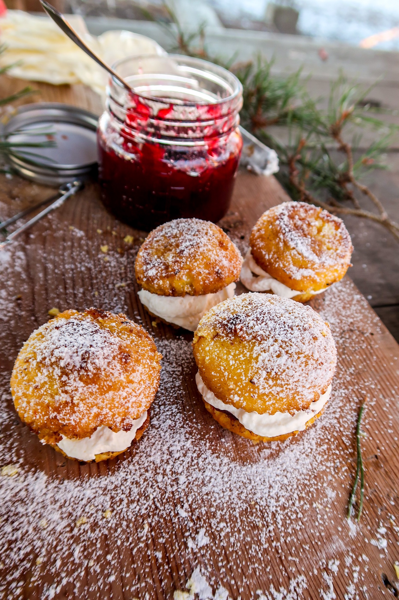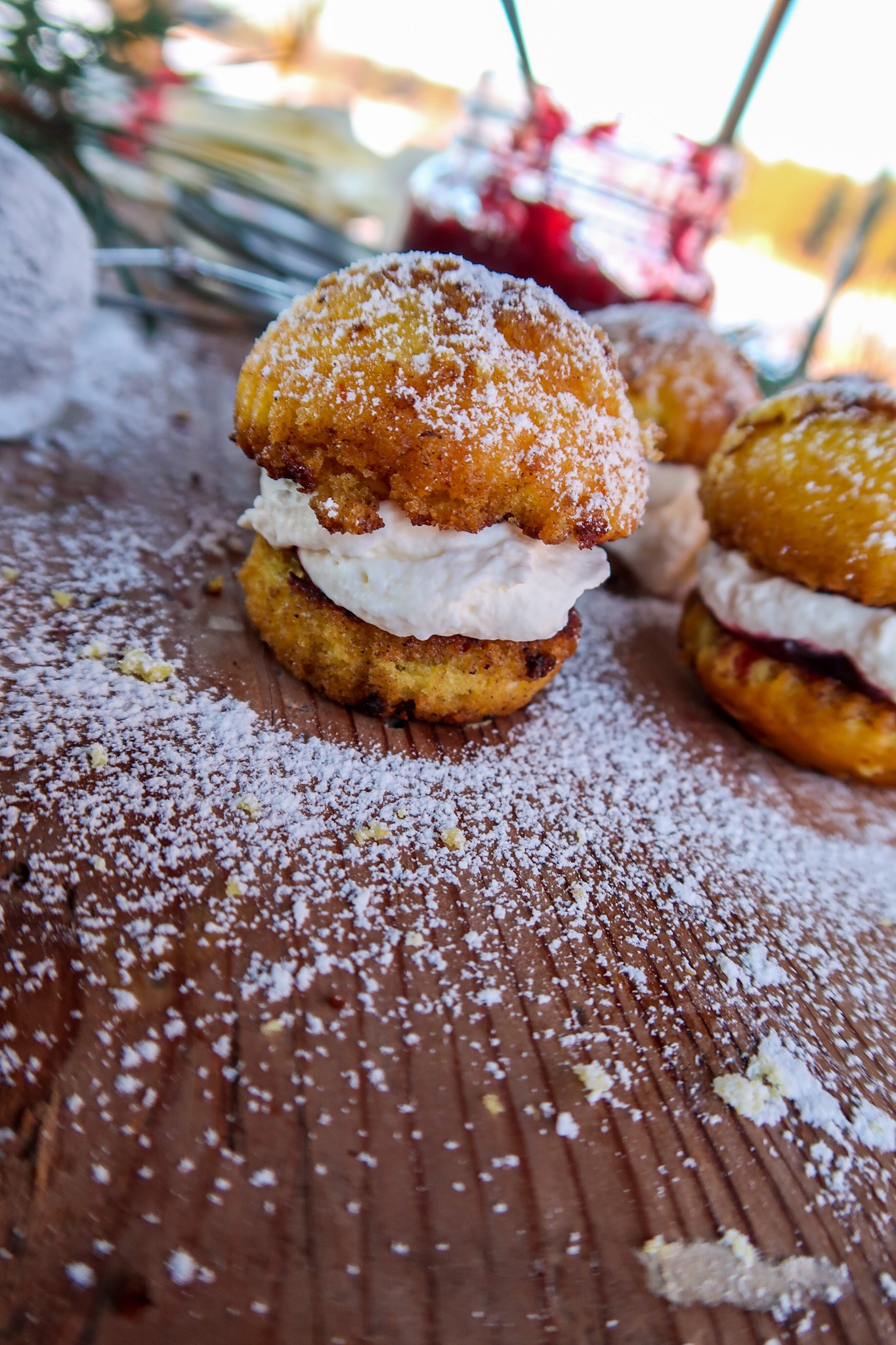 7) Ha i rörda lingon på bottendelen, på med grädde och sen på med toppen. Dofta över lite florsocker. Ät & njut!
