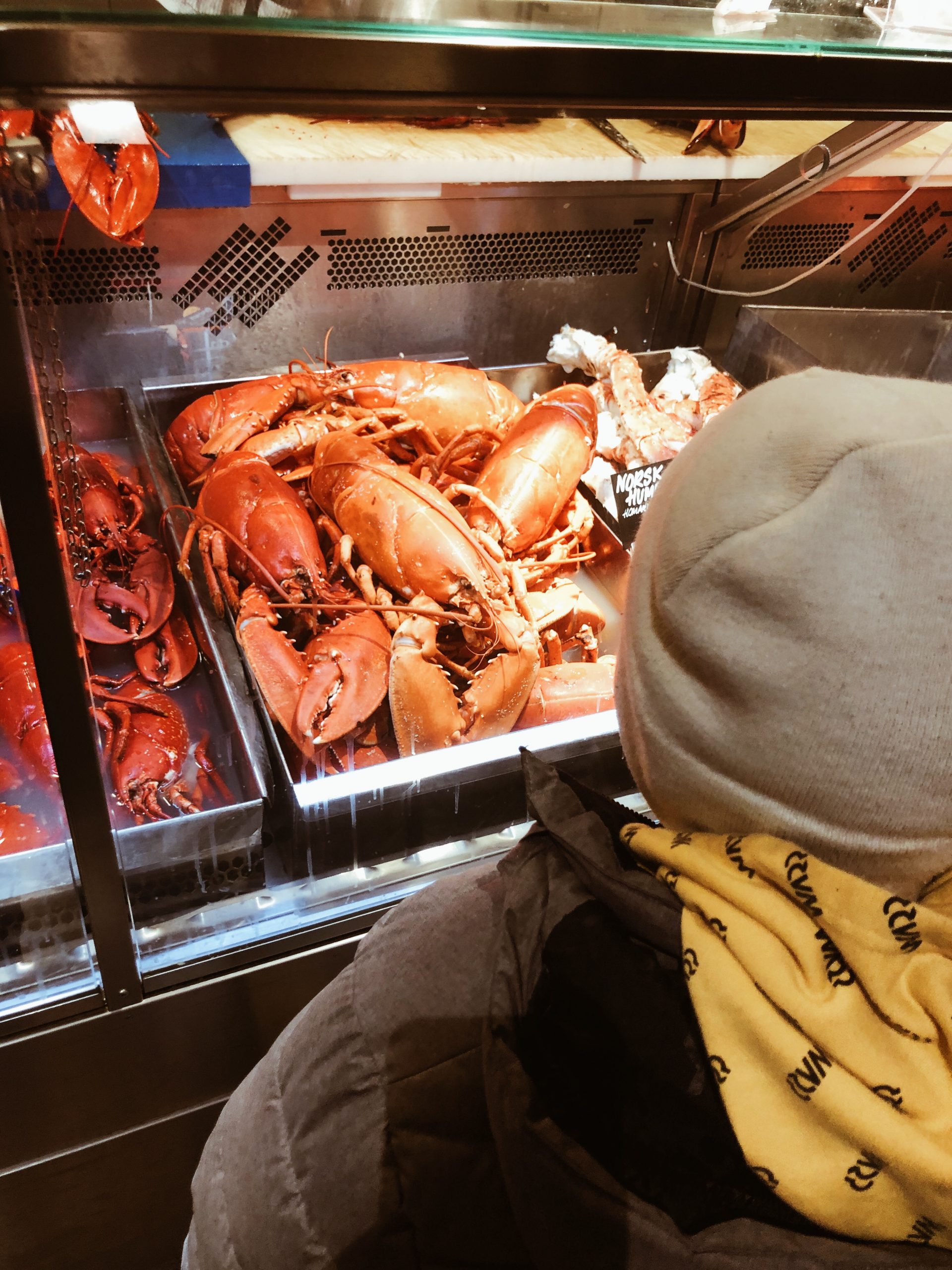 Efter vi bytt skorna så for vi iväg till Östermalmsgallerian för att äta. Vi gick länge omkring och kikade bland diskarna, så otroligt mycket gott. Jag ville köpa en hummer men kände att vi hade länge kvar innan vi skulle vara hemma. Jag är ju löjlig sådär med att saker blir gammalt eller dåligt, helst skaldjur.