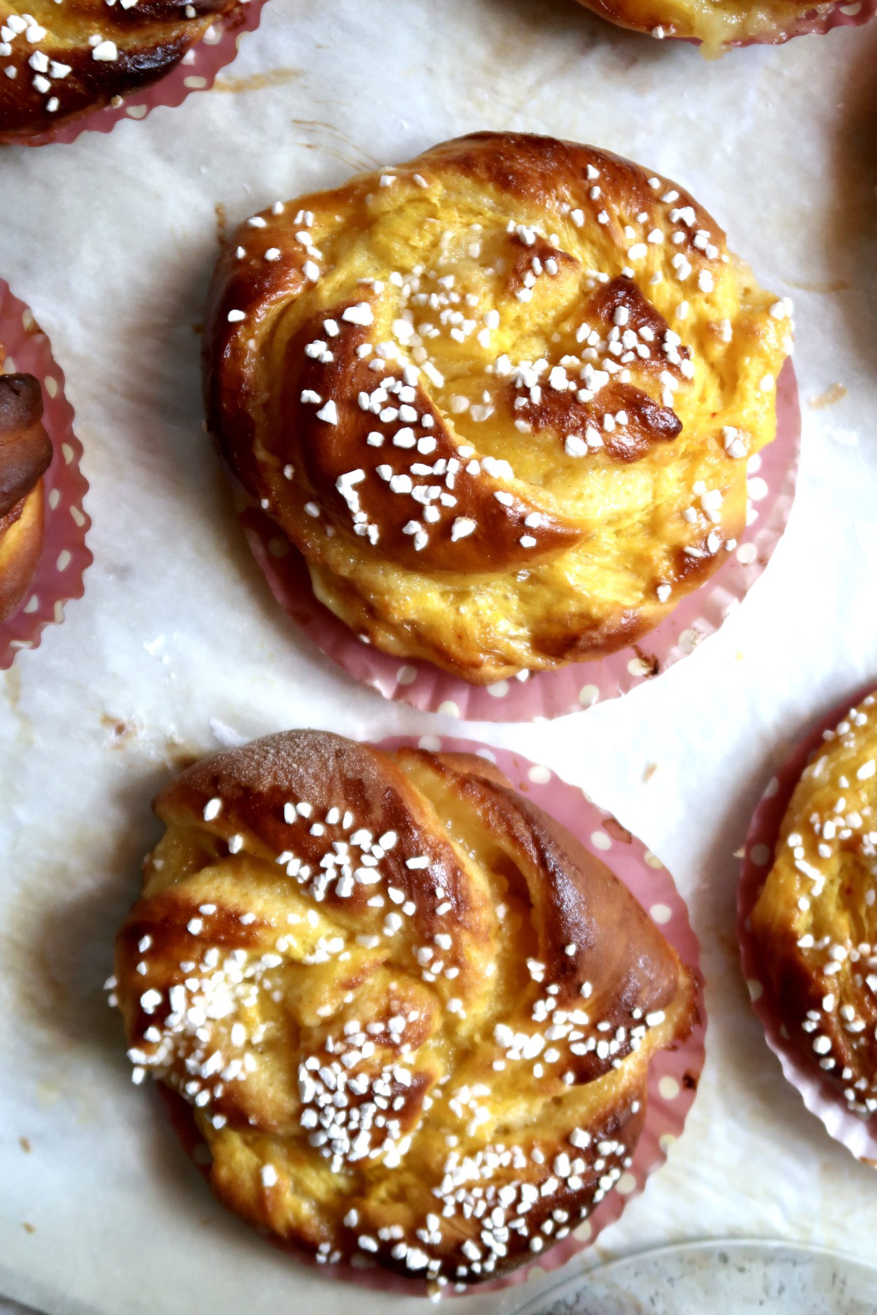 7) Pensla med ett ägg och strö på pärlsocker. Skjuts in i mitten av ugnen i ca 10-15 min. De ska få lite färg.