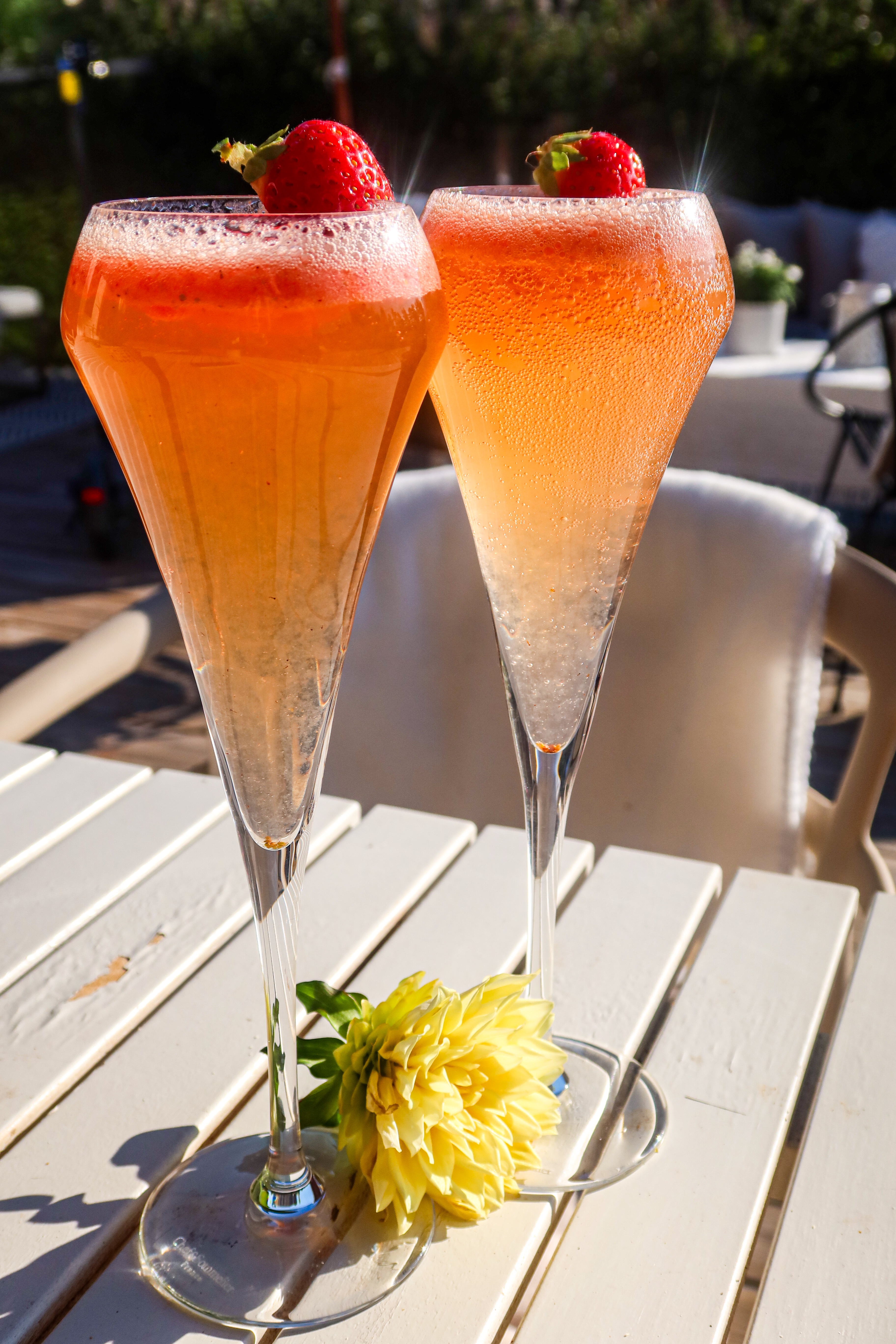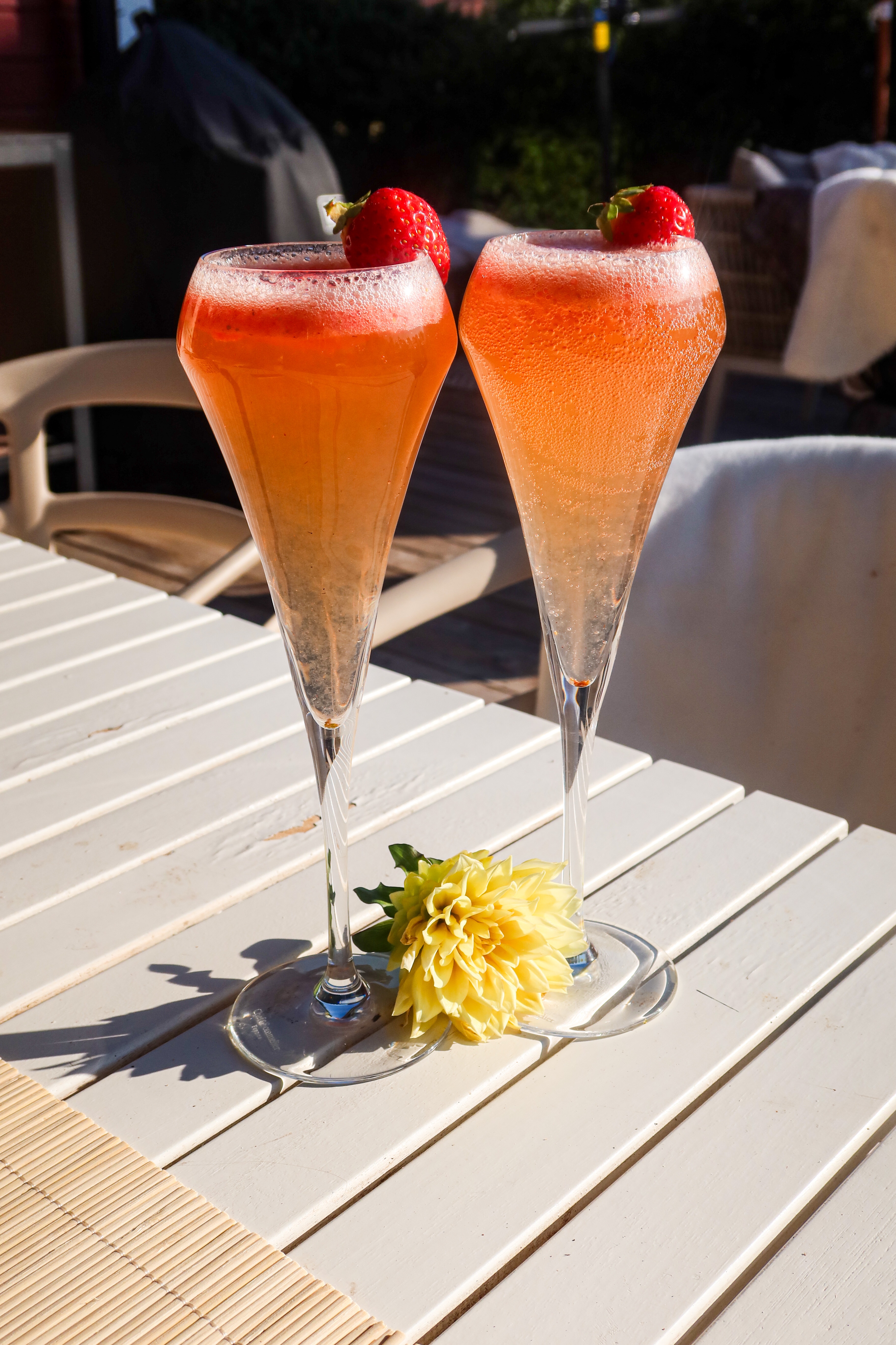 2) Häll i fyra glas och toppa med mousserande, med alkohol eller utan. Rör runt lite med en sked. Häll en liten slatt av jordgubbspuren högst upp. Dekorera med en jordgubbe.