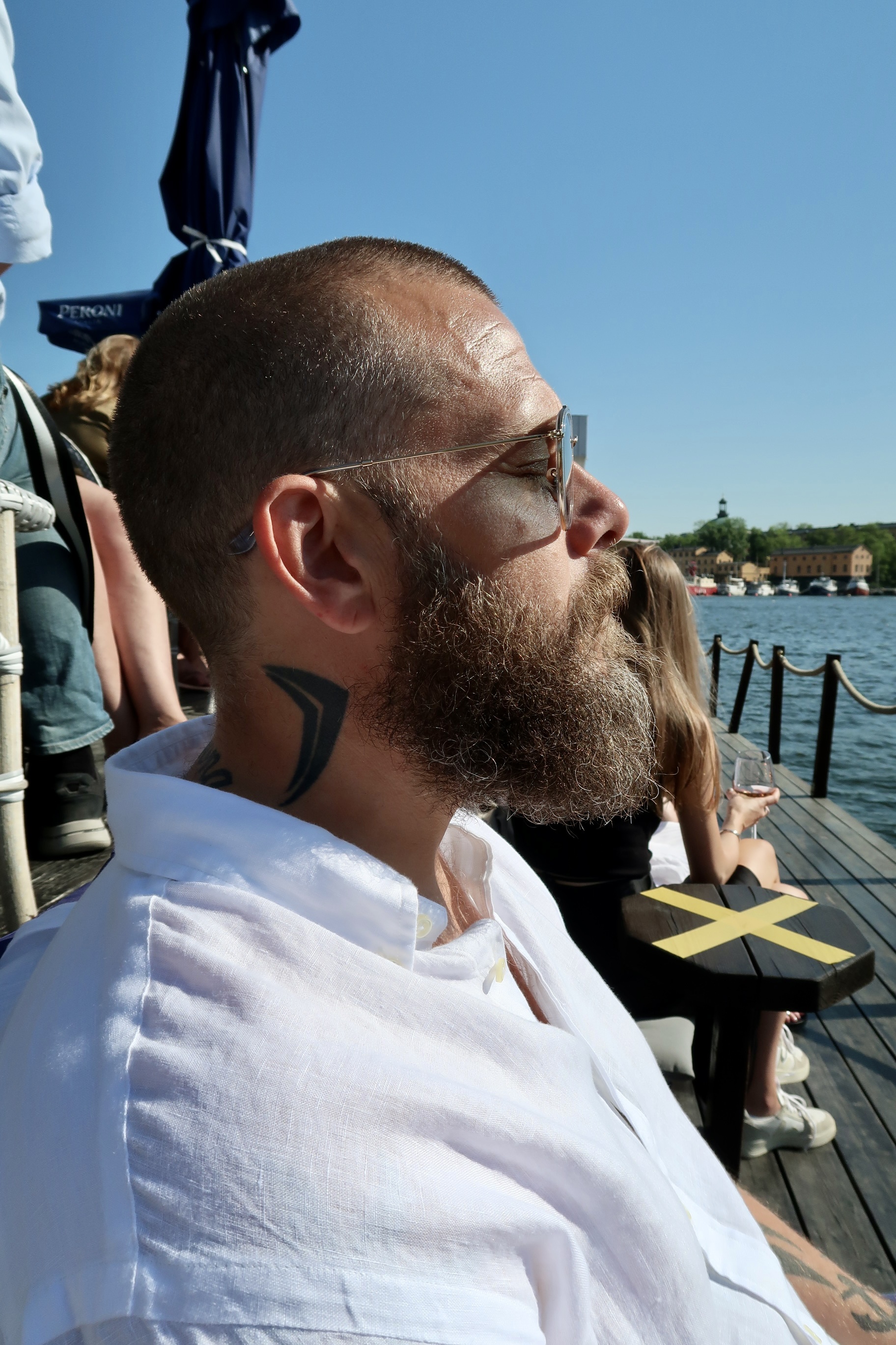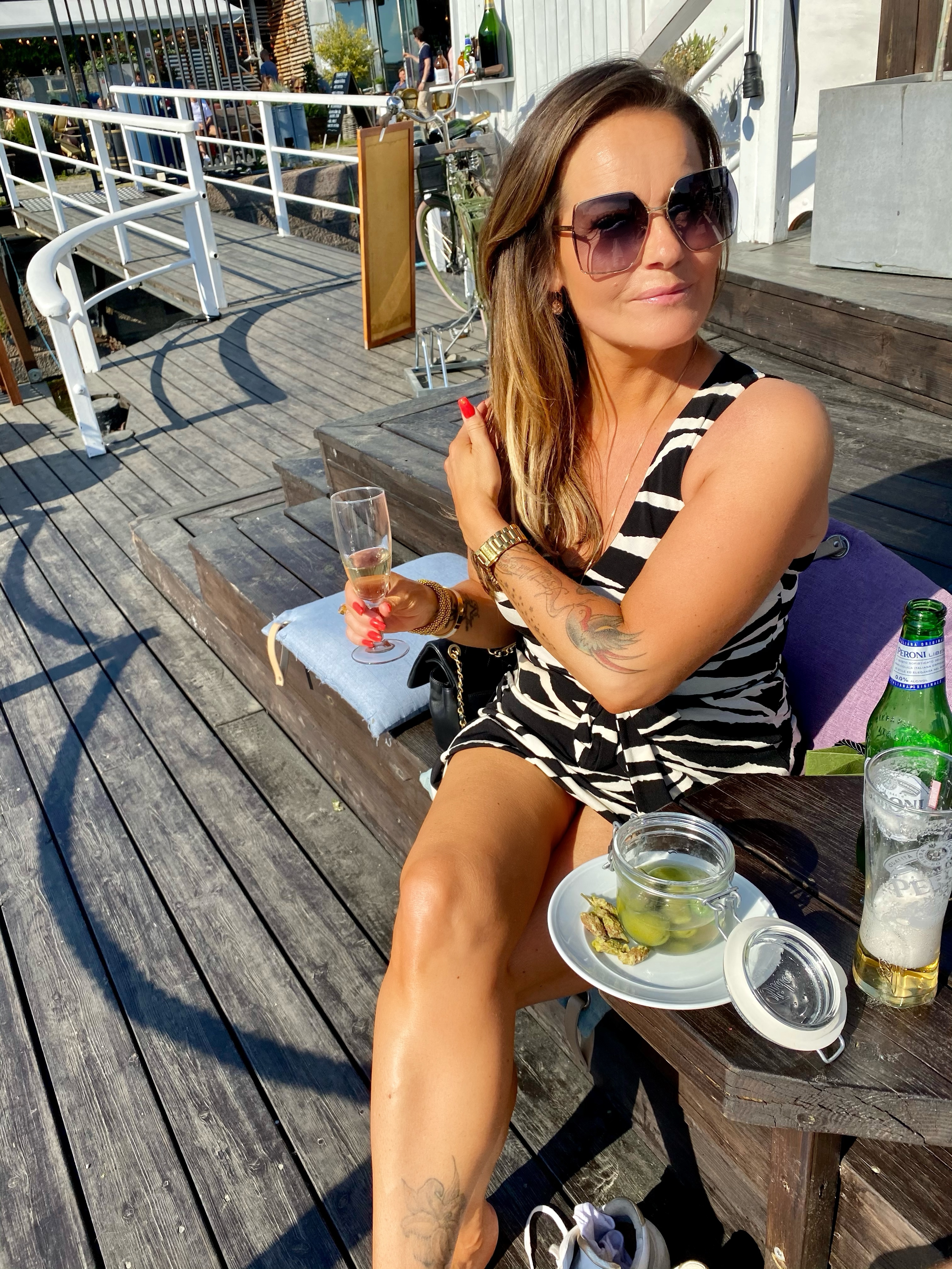 Efter maten gick vi bara ett stenkast bort till Ångbåtsbryggan, fick ett toppenbord där vi kunde sitta och njuta precis vid vattnet med ansiktet mot solen. Var tvungen att ta namnet på oliverna för de var de gooooodaste jag någonsin ätit. Sinisi heter dom och är från Sicilien. Stora, köttiga, smöriga och sådär galet juicy. Sååå gott till ett glas bubbel. Mums mums!