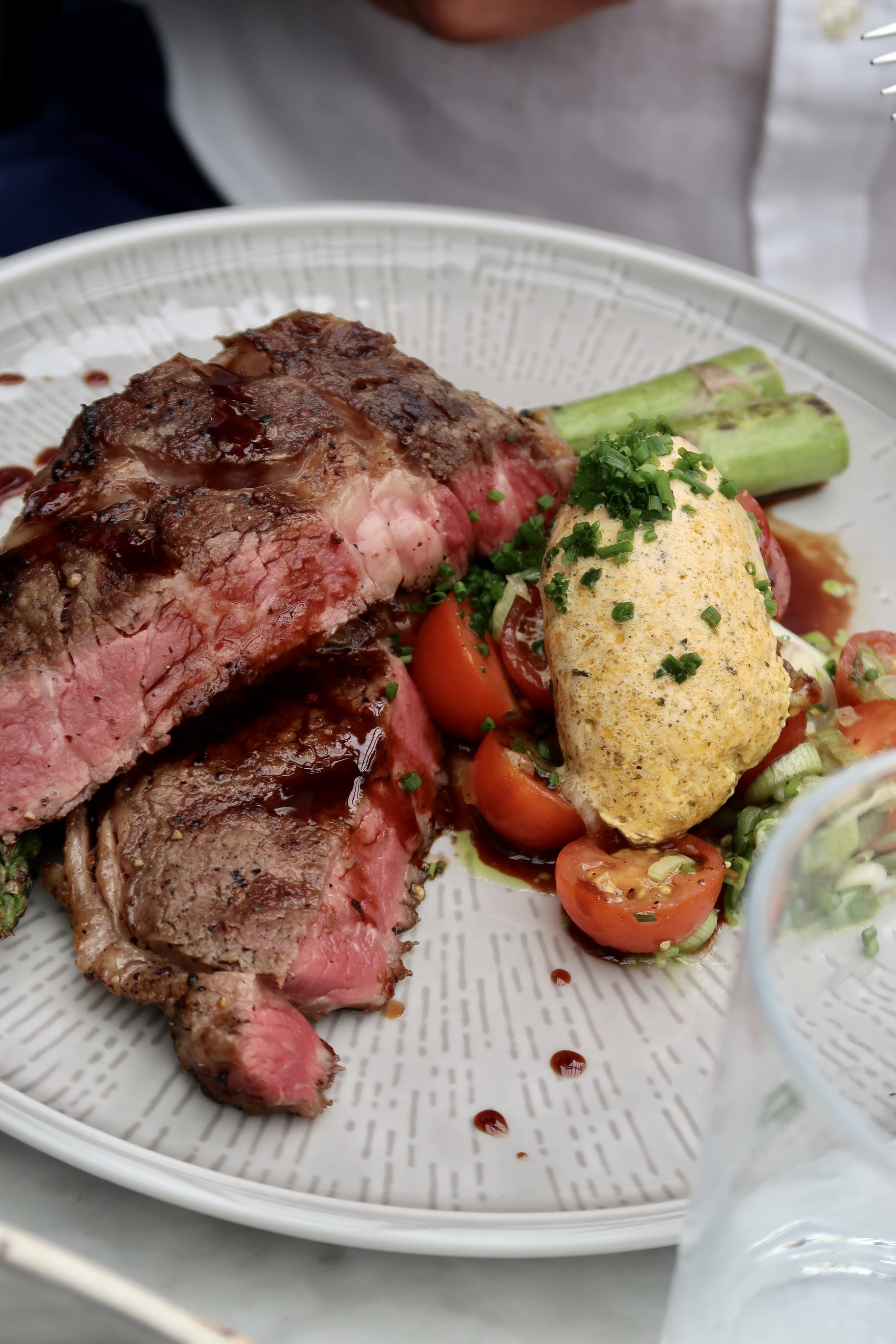 Tony tog entrecote med rostad grön sparris, kryddsmör och friterad potatis. Han tyckte också att det var såååå gott.
