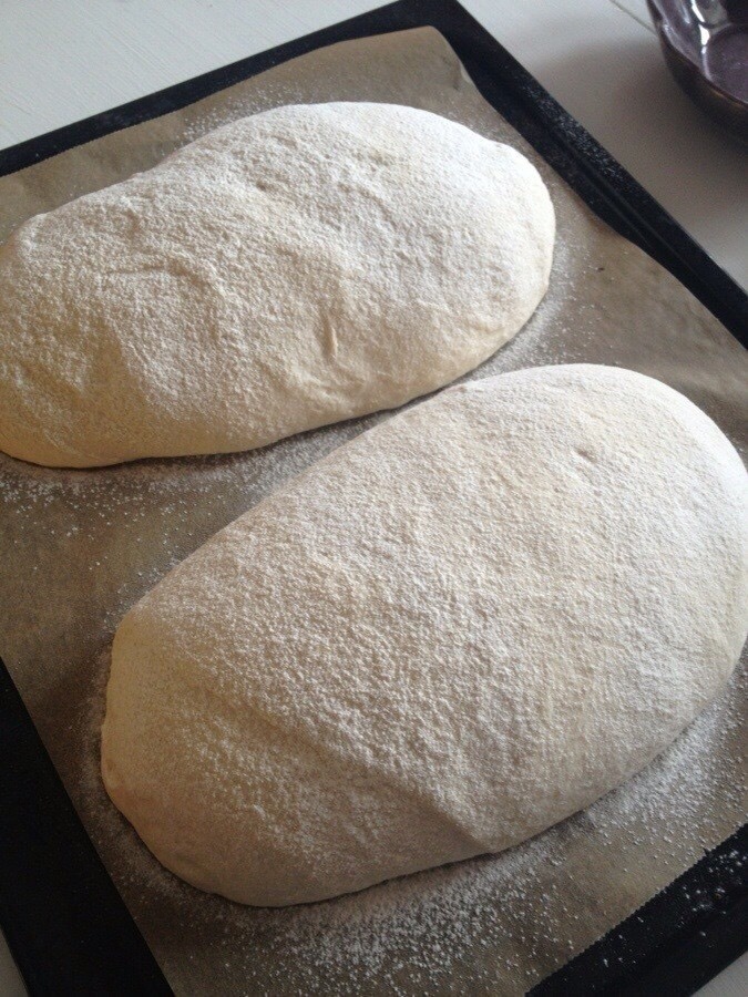 4) Häll sedan upp degen på bordet, hantera det så lite som möjligt. Forma försiktigt antingen till 2 bröd eller 4 baguetter. Lägg på bakplåtspapper. Sikta på mjöl och ha på plast igen. Jäs i ytterligare en timme. Sätt ugnen på 260 grader.