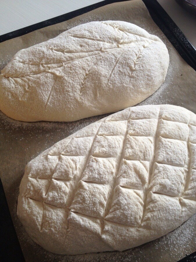 5) Skär sedan valfria mönster i brödet. Sänk ugnen till 225 när du stoppar in bröden i ugnen. Gräddas i mitten av ugnen i 15-20 min.