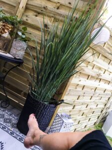 Här satt jag i en tunn klänning och bara njöt av det svala. Satt också och njöt av våra insynsskydd som vi nu fått upp. Nu är vi alldeles skyddade på altanen där vi har vår bubbelkopp. Nu kan man strutta runt i bara mässingen.