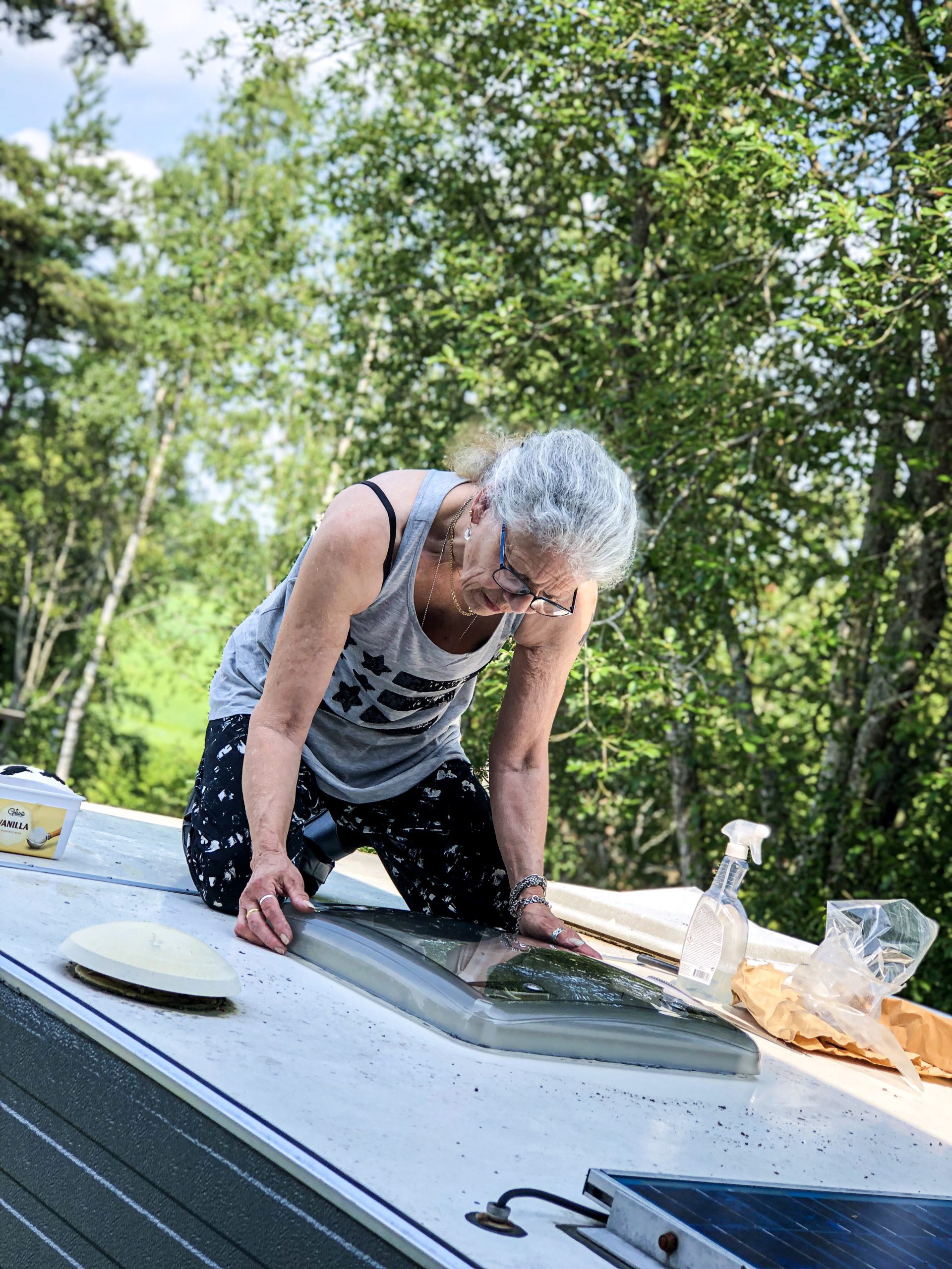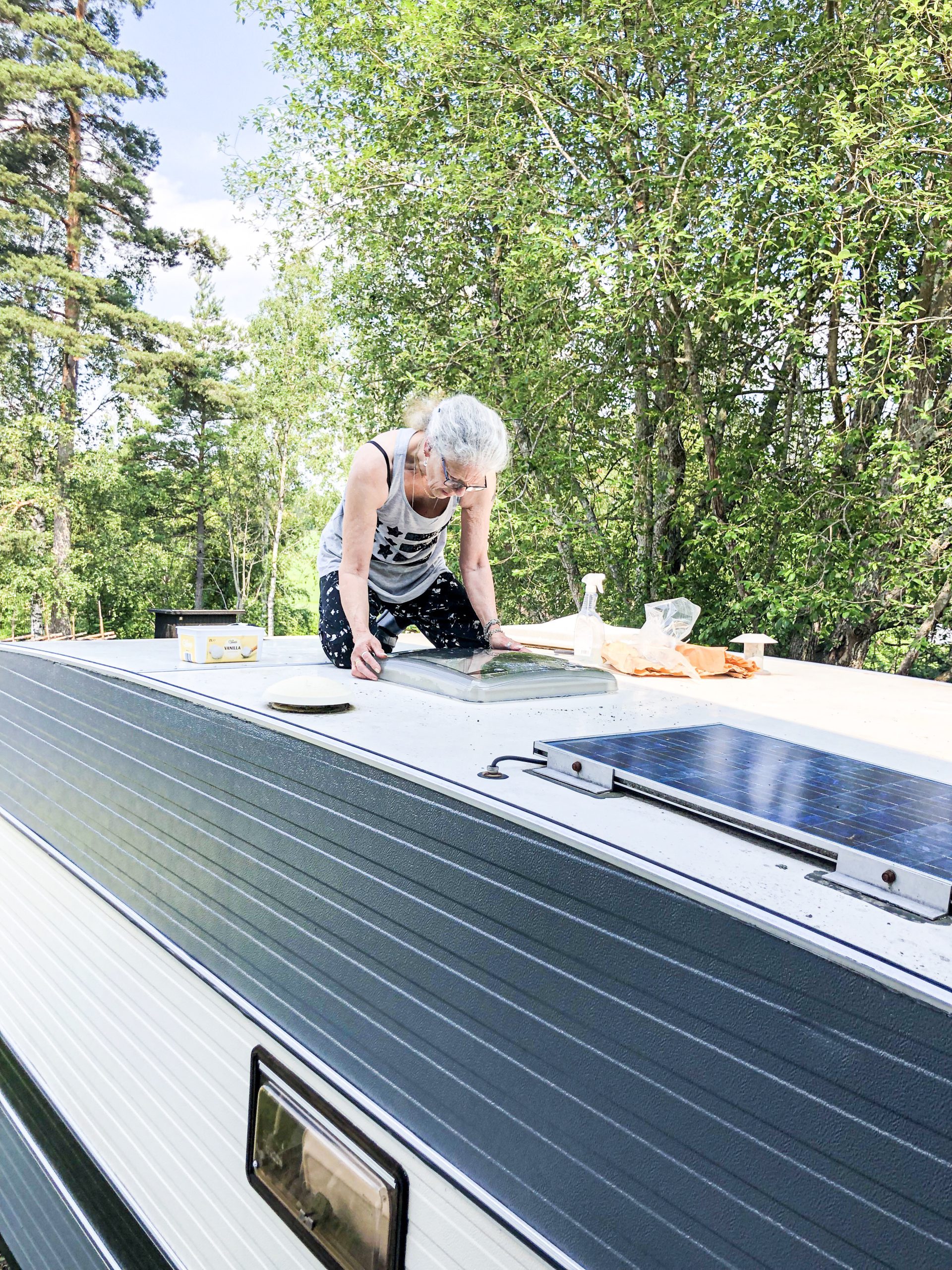 Svärmor uppe på taket helt orädd, jag kissade nästan i byxan bara av att se henne stövla upp där. Jag erbjöd mig men hon schwongade upp där innan jag var klar med meningen ens. Svärfar skruvade och svor inne på den trånga toan. Undrade varför i helvete den ena takluckan inte ville lossna? Well, sitter skruvarna kvar är det lite svårt att få loss dom, ja så kan vi väl säga…. haha!