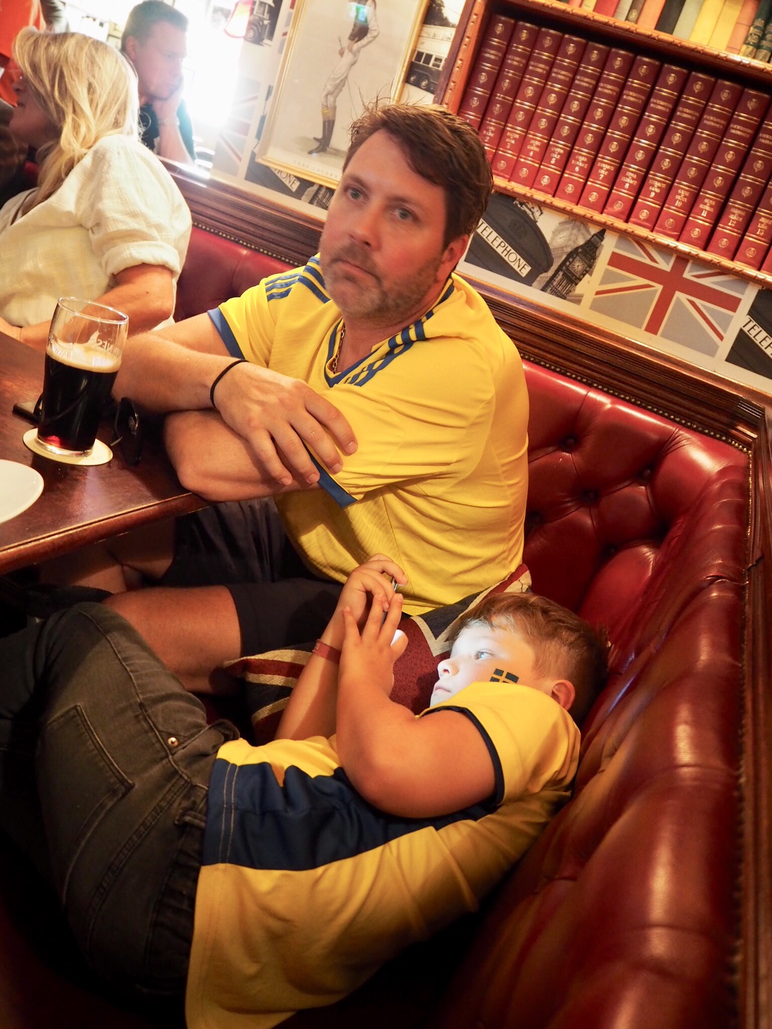 Det var ett taggat gäng som tog sig till Players idag för att se fotbollen! Milo har en svensk flagga på kinden men den kom inte med. Det är de finska höga kindbenen som döljer det.
