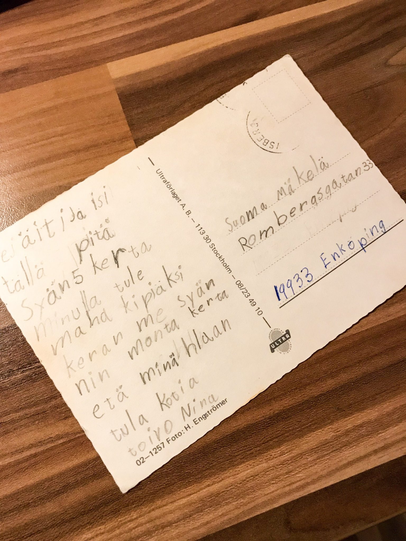 Jag var där i 2 veckor och längtade sönder efter min mamma och pappa. Jag skrev ett vykort på riktigt knackig finska och idag fick jag för första gången läsa vykortet. Har alltså inte läst det sen jag skickade det som 9 åring.