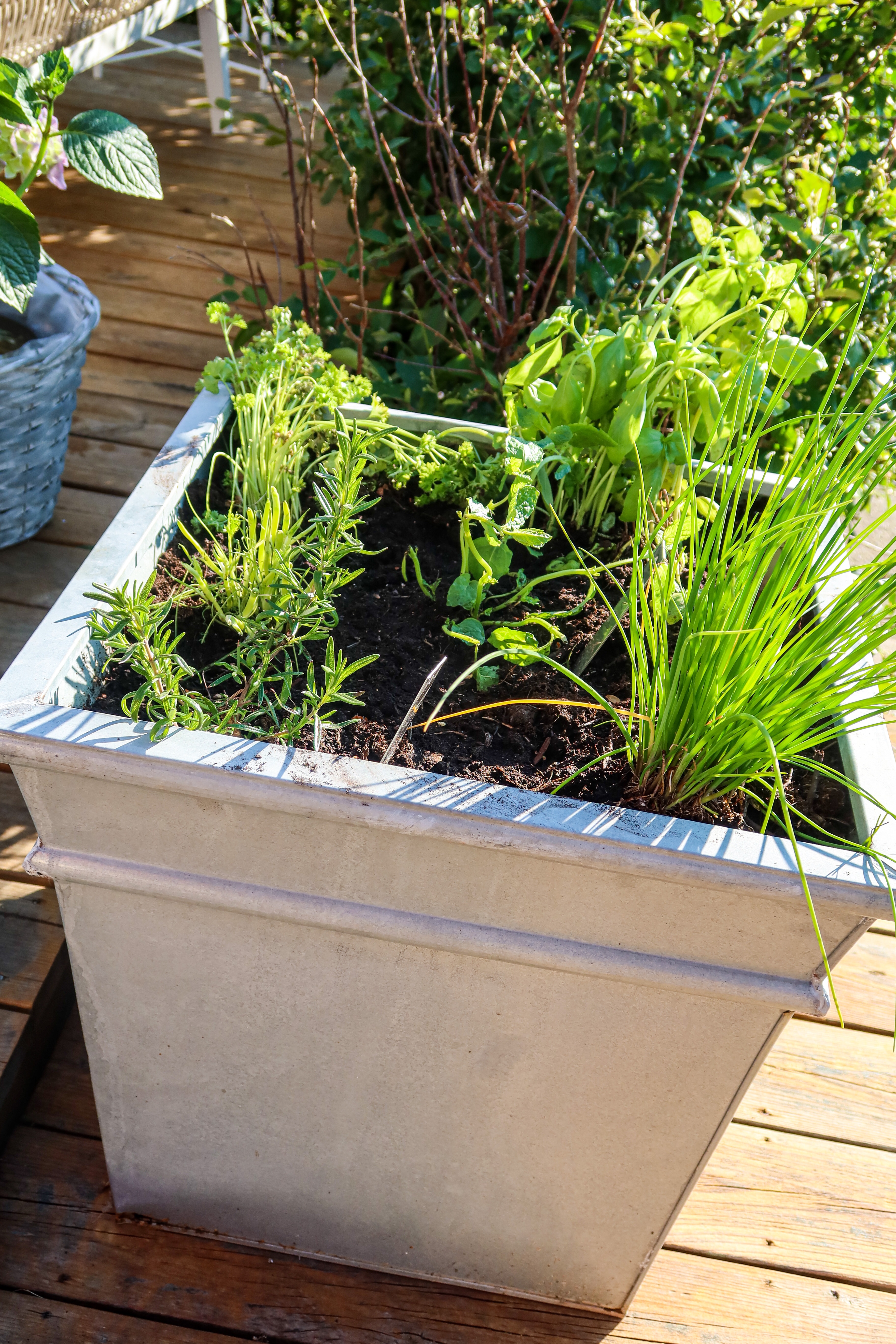 Självklart lite örter också. Dessa använder jag massor i matlagningen under hela sommaren. Jag har gräslök, dill, persilja, rosmarin, mynta (ja jag vet att den kommer bre ut sig över hela och det är bara bra – har det i sallader, drinkar och som dekoration i bakverk så det går åt, upplever inte heller att den stör de andra örterna så de får samsas i den här stora zinkkrukan) och sist men inte minst basilika. Jag tror att jag ska ha en helt egen kruka med basilika och med mynta också för basilika använder jag också massor.