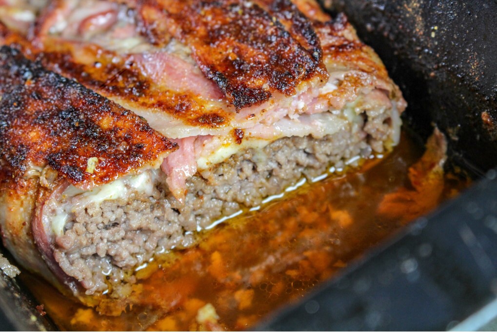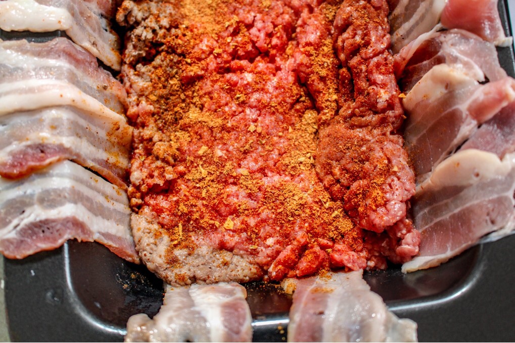 2) Ta köttfärsen som den är och platta ut den över baconen. (Jag tinade köttfärsen i micron och den hann att bli lite brun på ena kanten ifall du undrar.) Krydda 1/3 av påsen över köttfärsen. Lägg på osten. Vik sedan över baconskivorna över osten och köttfärsen.