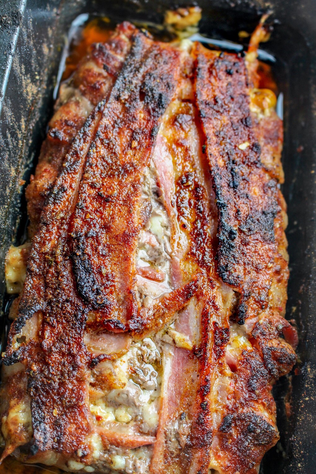 3) Krydda sista tredjedelen över baconen. Skjuts in i ugnen på 200 grader i 30 min. Skär sedan upp i bitar till servering.