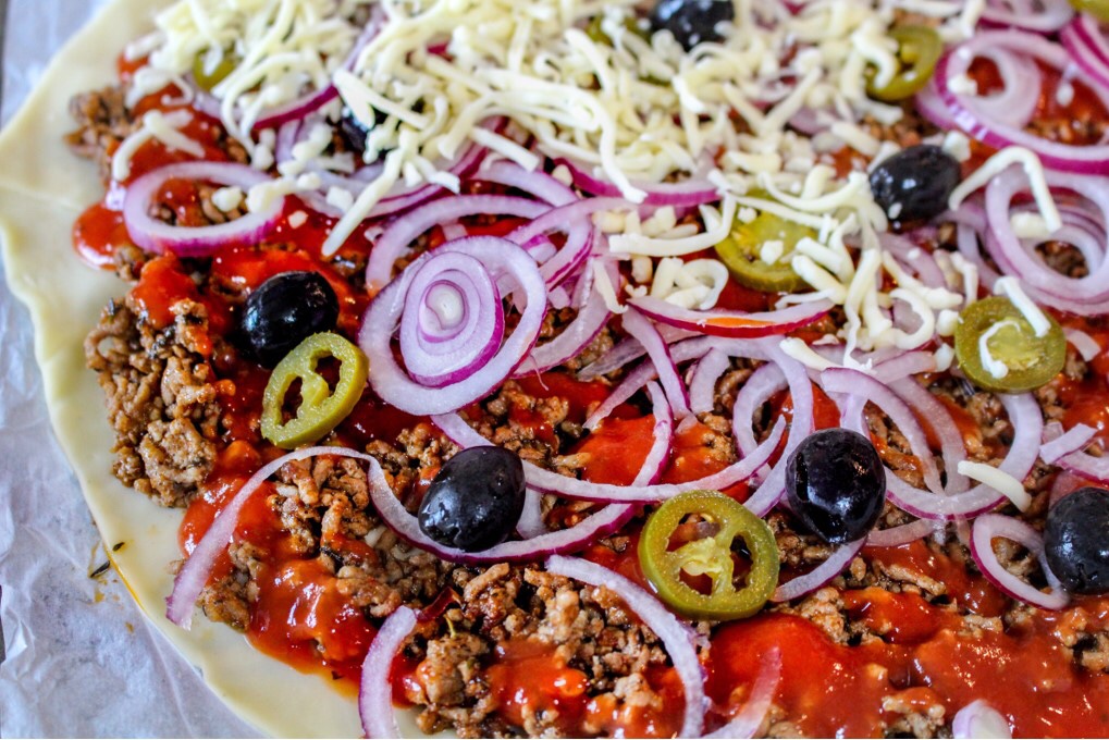 2) Lägg köttfärsen på pizzadegen. Häll över tomatsåsen. Skala och skiva rödlöken, ha på den. Ha också på jalapeños och oliver.