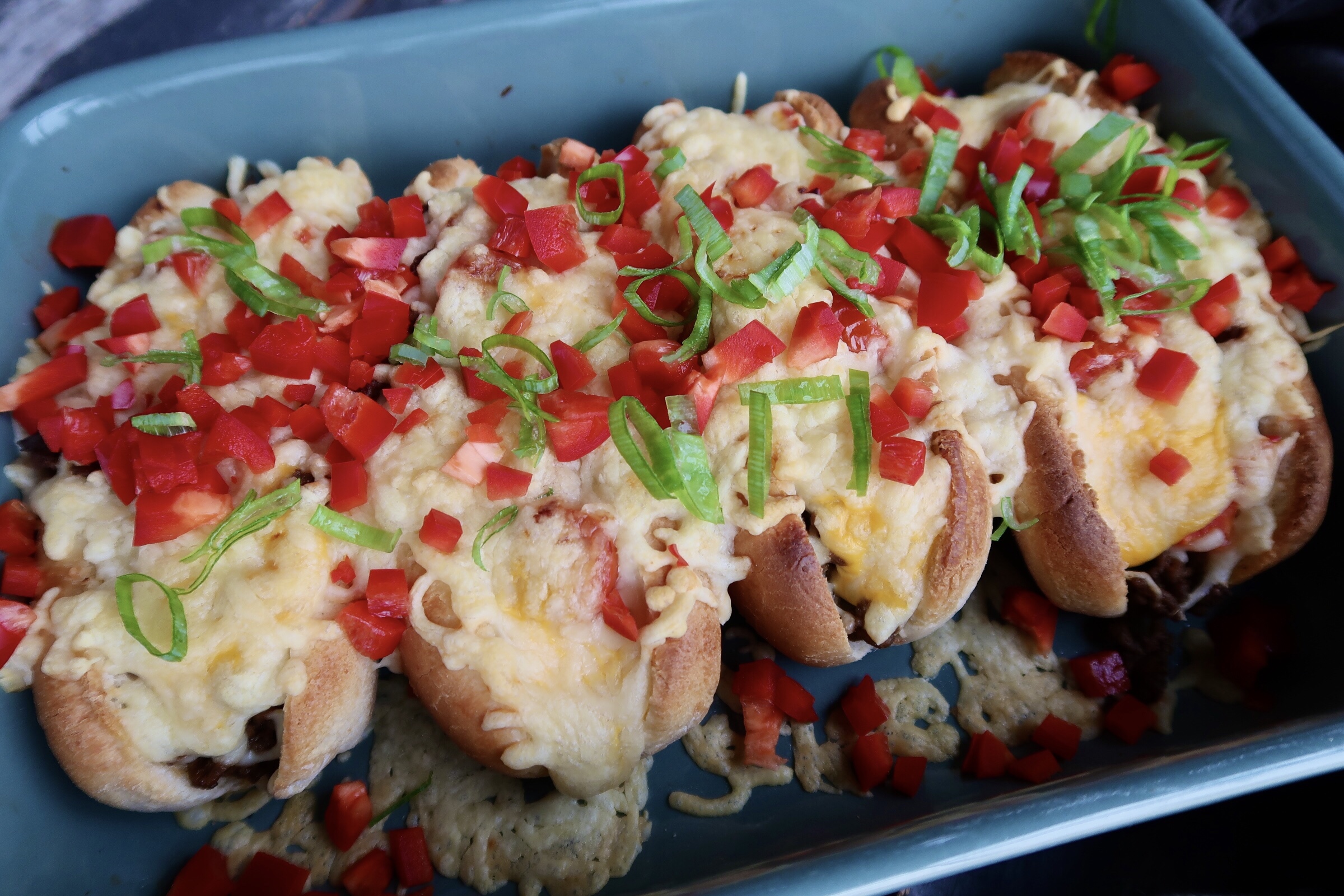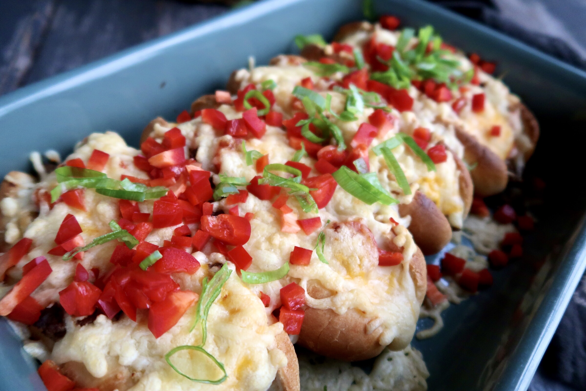 2) Lägg korvbröden i en ugnsfast form. Fyll med tacoköttfärs. Låt dom stå lite öppet.