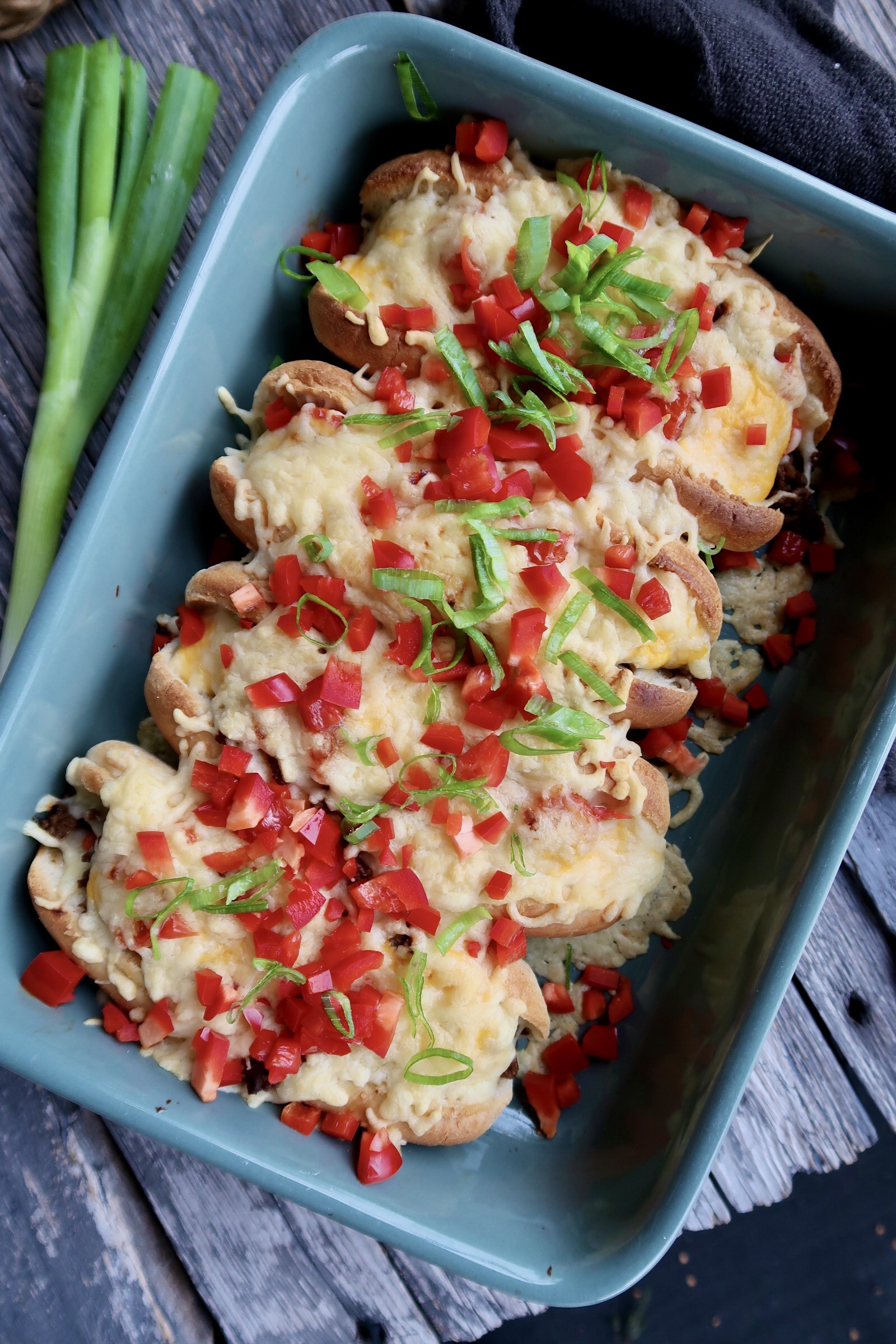 5) Ha på hackad paprika och salladslök. Servera med lite tacosalsasås och gräddfil eller creme fraiche.