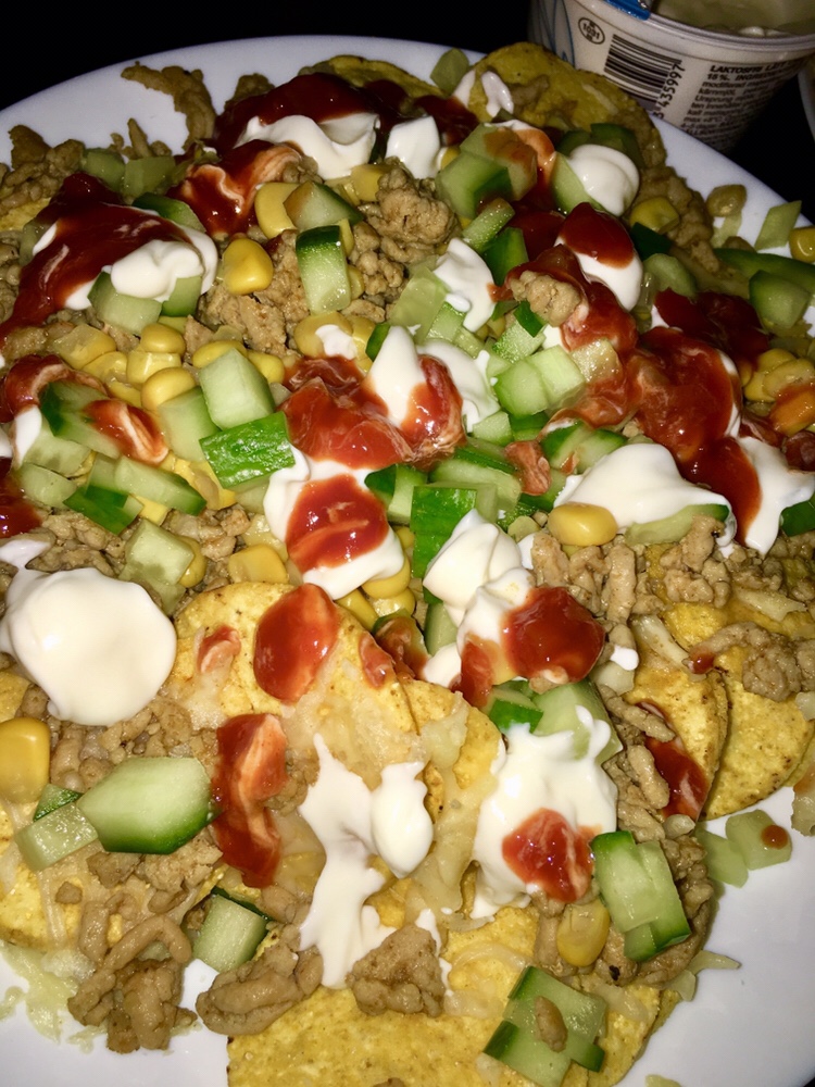 Ingen höjdarbild men här har vi min nachotallrik med kycklingfärs. Det var något som inte stämde när jag började äta den….det var ju att färsen ska med in i ugnen och gratineras. Skitsamma – gott som tusan var det i alla fall.