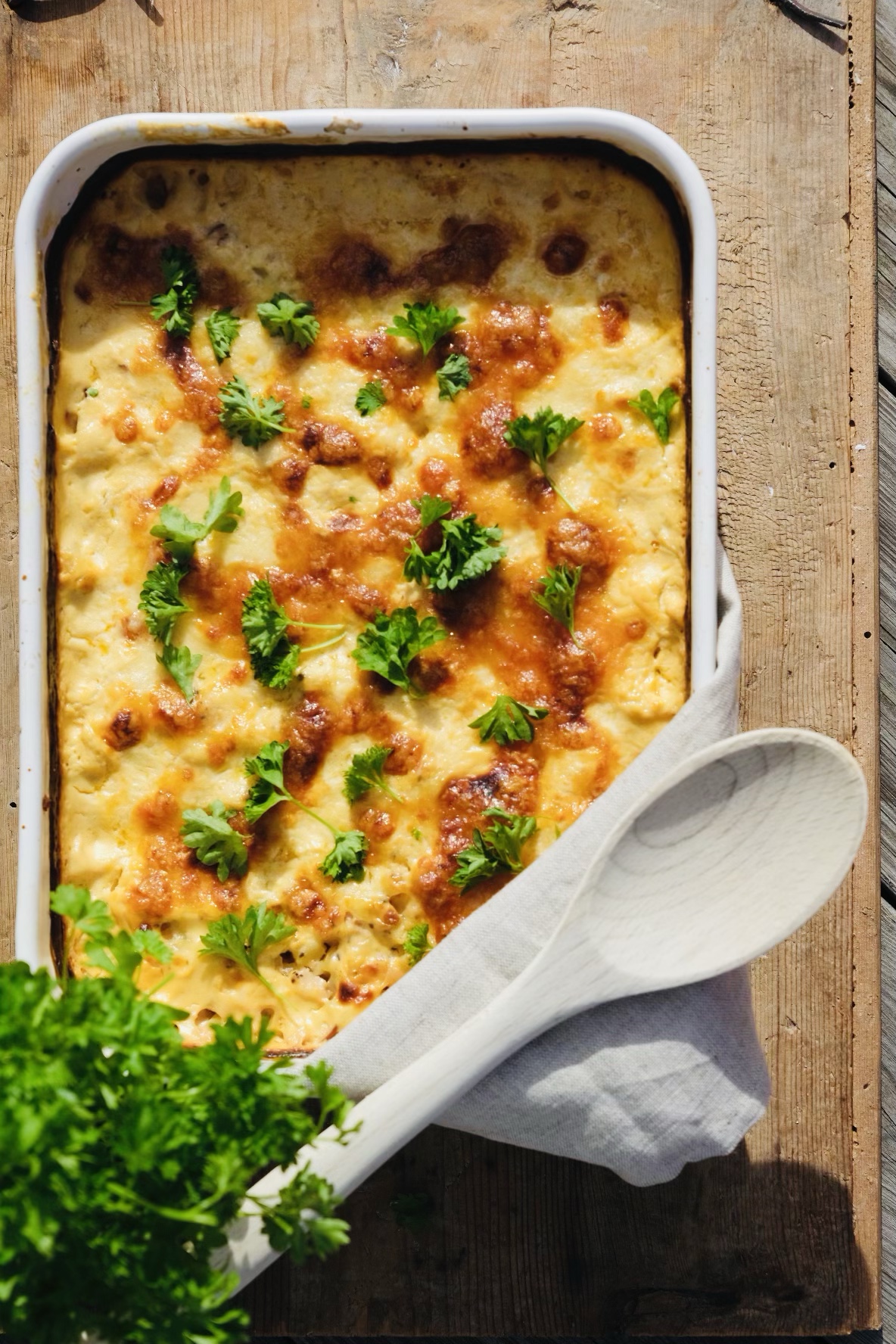 4. Blanda Philadelphiaosten med grädden. Vispa runt så det blandas ordentligt. Häll allt över potatisblandningen. Skjuts in i mitten av ugnen i först och främst 40 min. Öppna sedan och ha på den rivna osten, låt stå i ca 20 min till tills osten fått fin färg. Toppa med hackad persilja och ät med grönsallad. Familjen tyckte det var supergott.