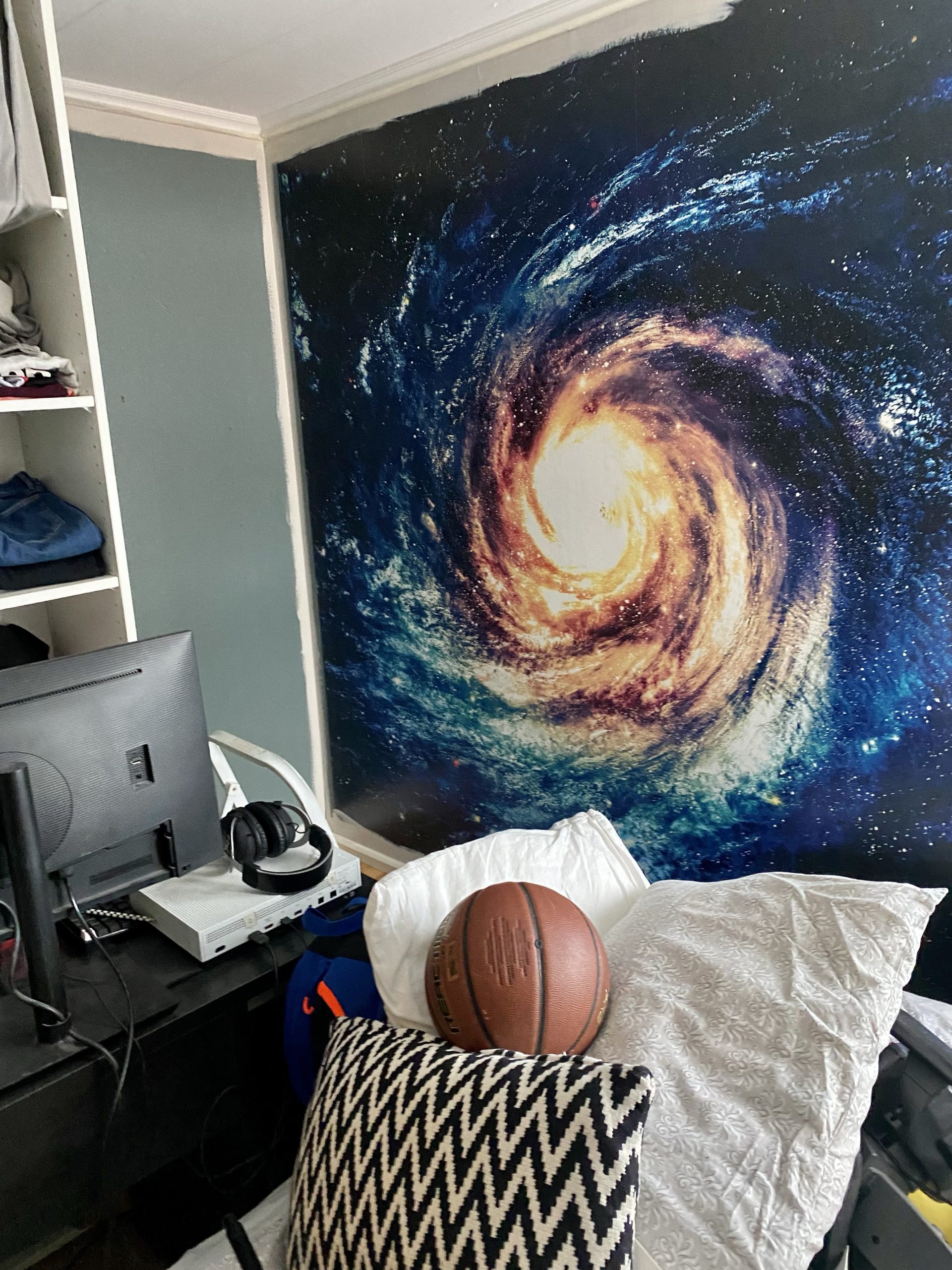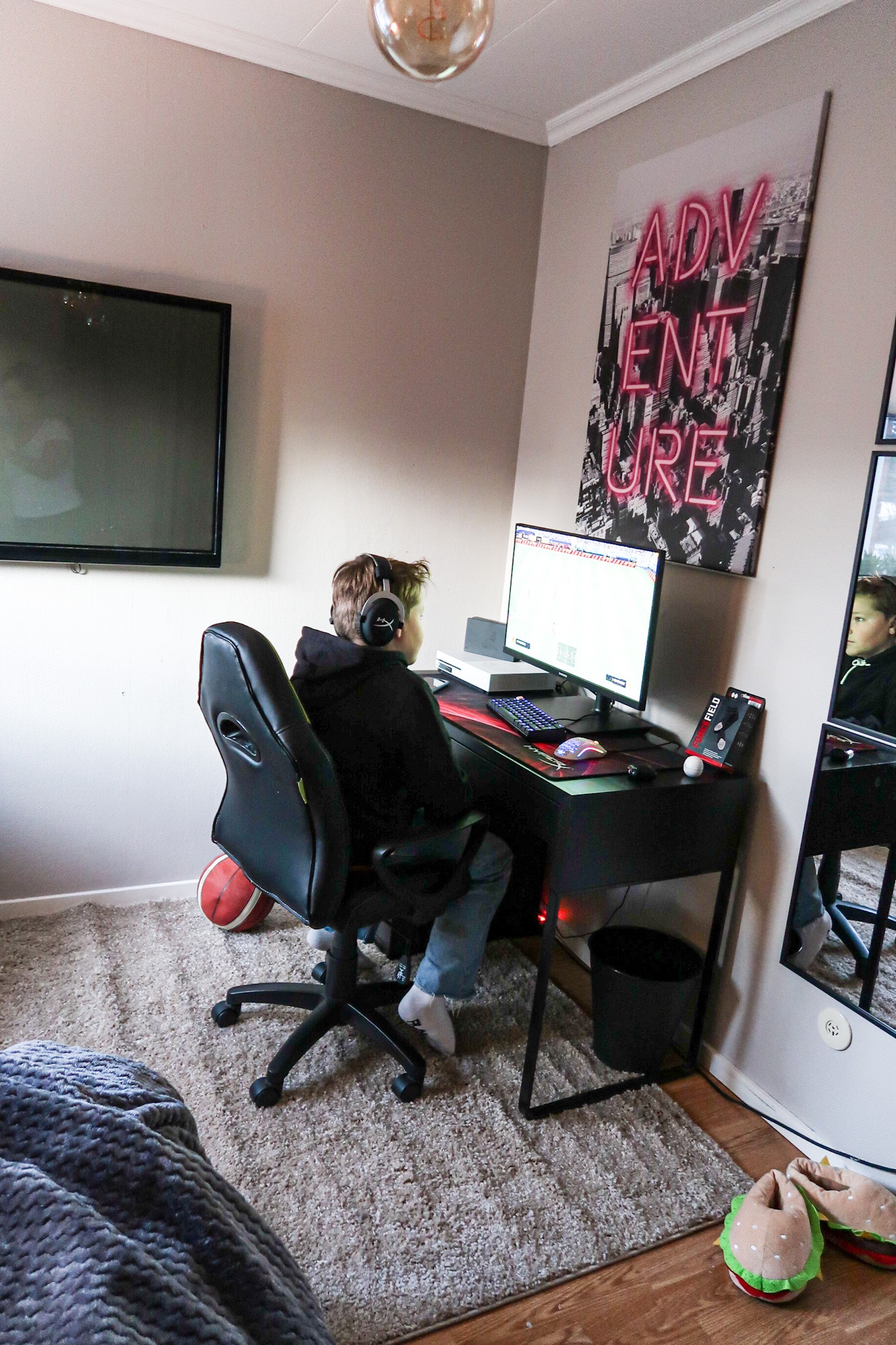 Här har vi spelhörnan. Vi ska inhandla en ny gamingstol med lite högre rygg nu när han blivit längre. Sen är vi klara. Vi är verkligen supernöjda själva, roligast av allt är att han är så galet nöjd och vill hänga där i sitt rum hela tiden nu. Vi får tvinga ned honom när vi ska äta och när vi vill träffa honom. Haha…. Men det är kul, det är som det ska vara.