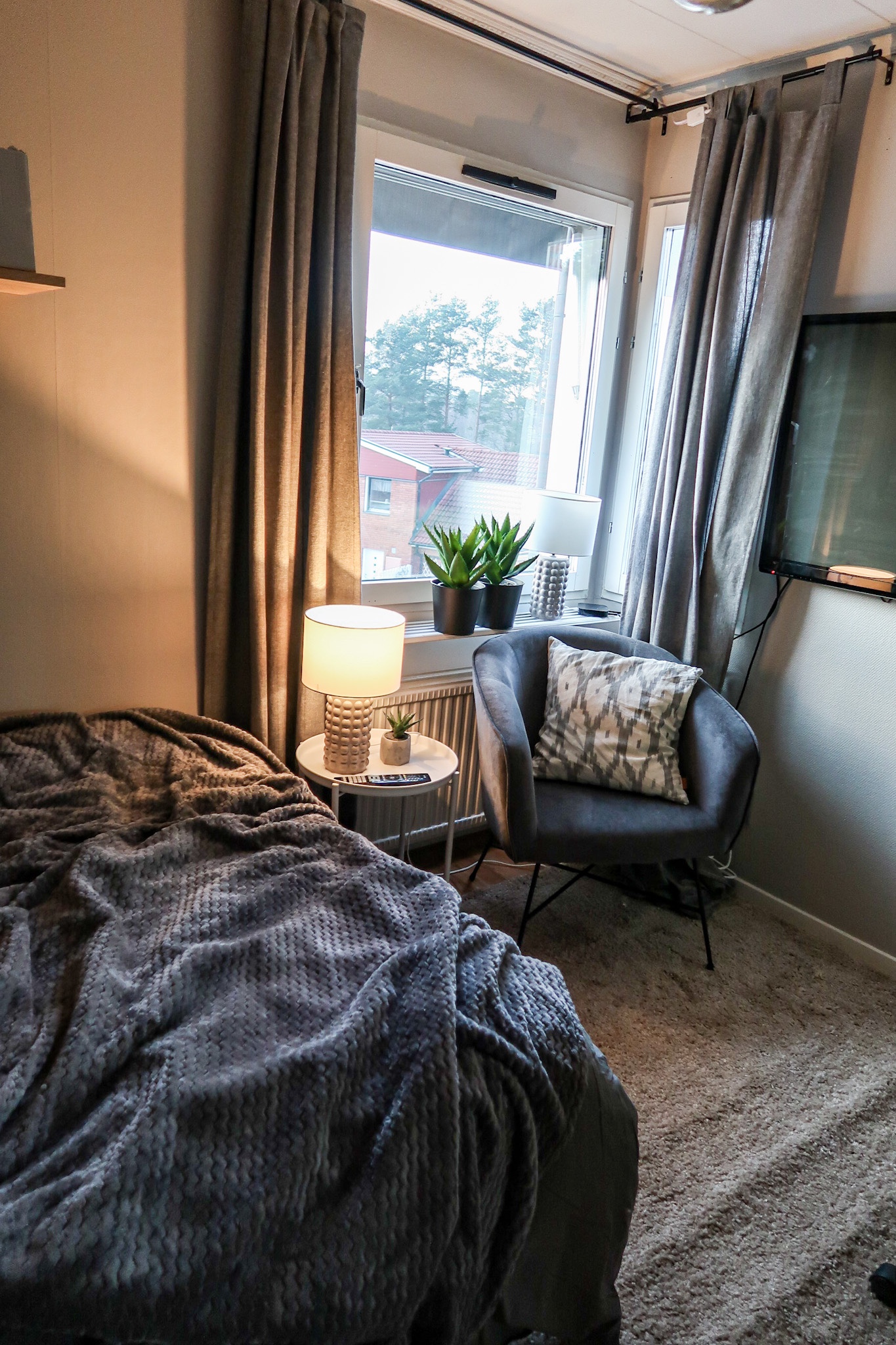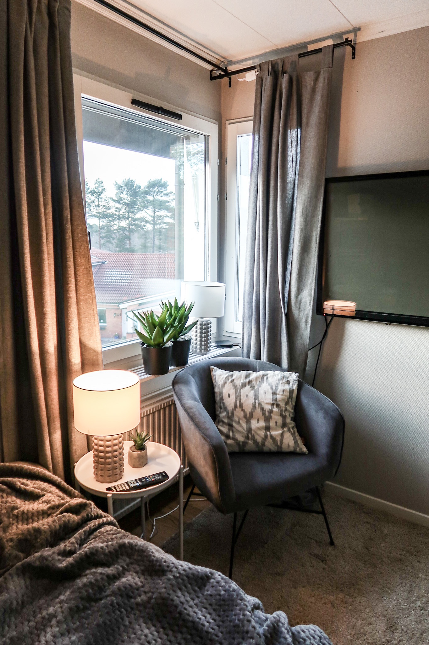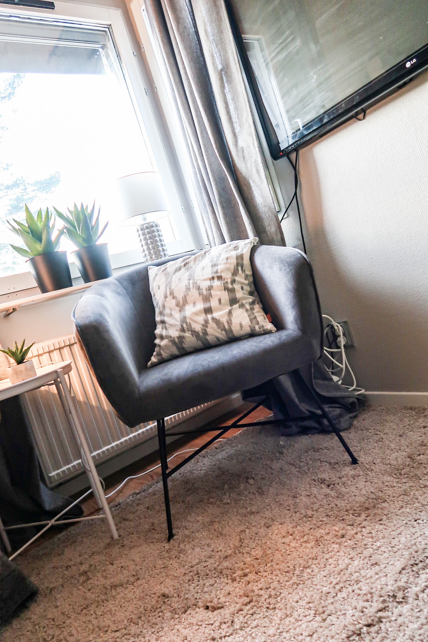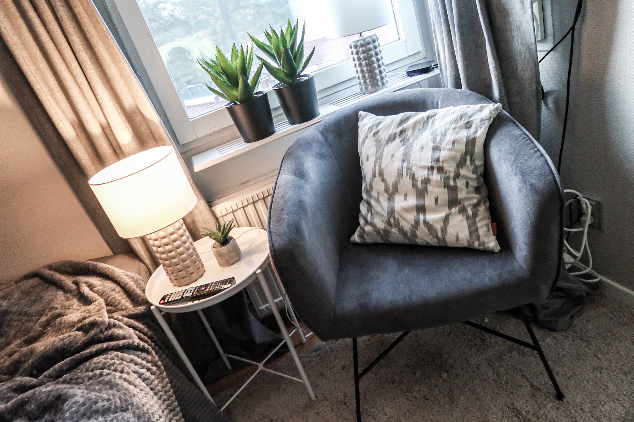 Fåtölj HÄR // Lampor HÄR // Gardiner HÄR // Matta HÄR (så billig) // Konstväxter HÄR // Krukor HÄR // Pläd HÄR