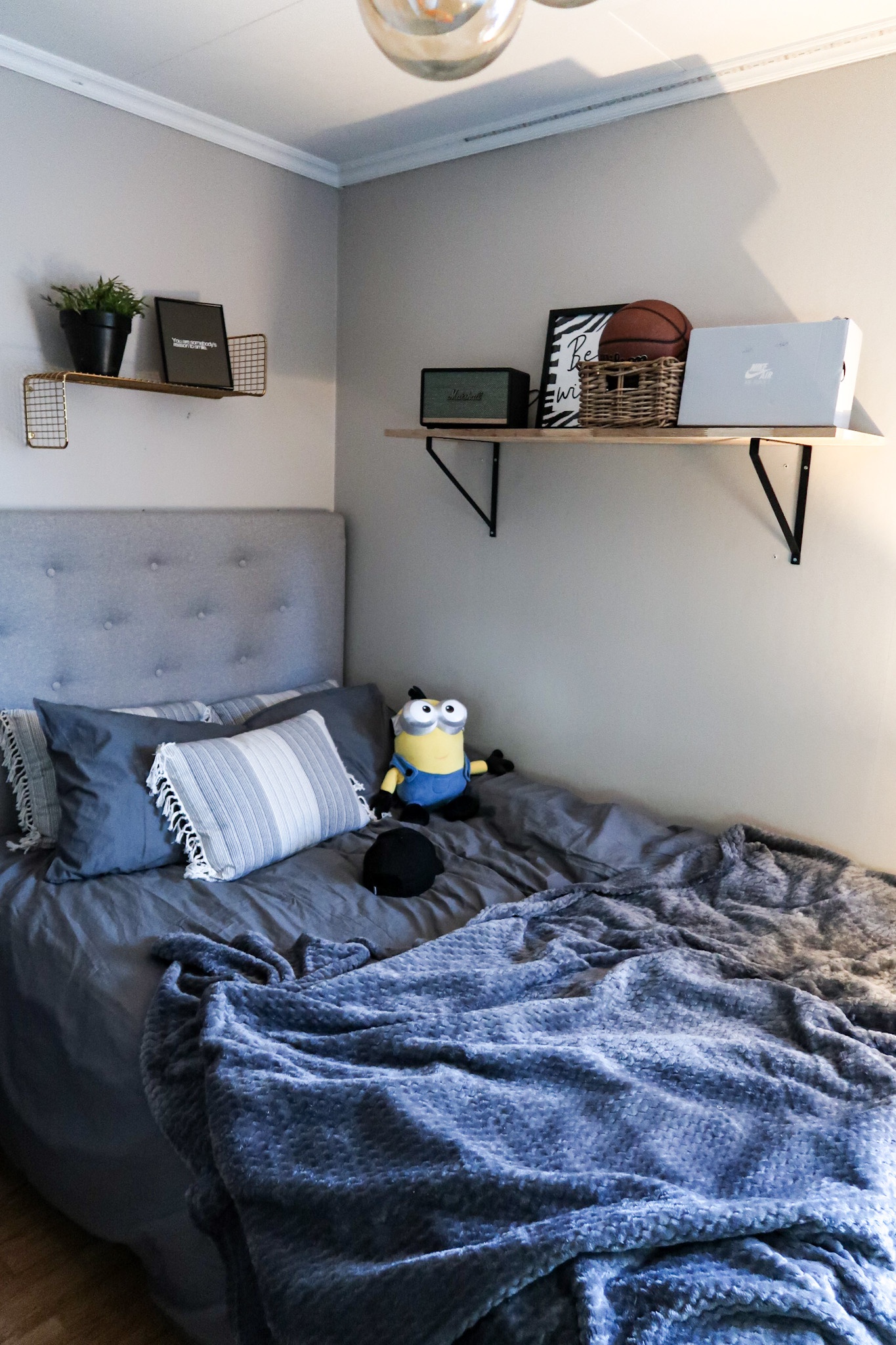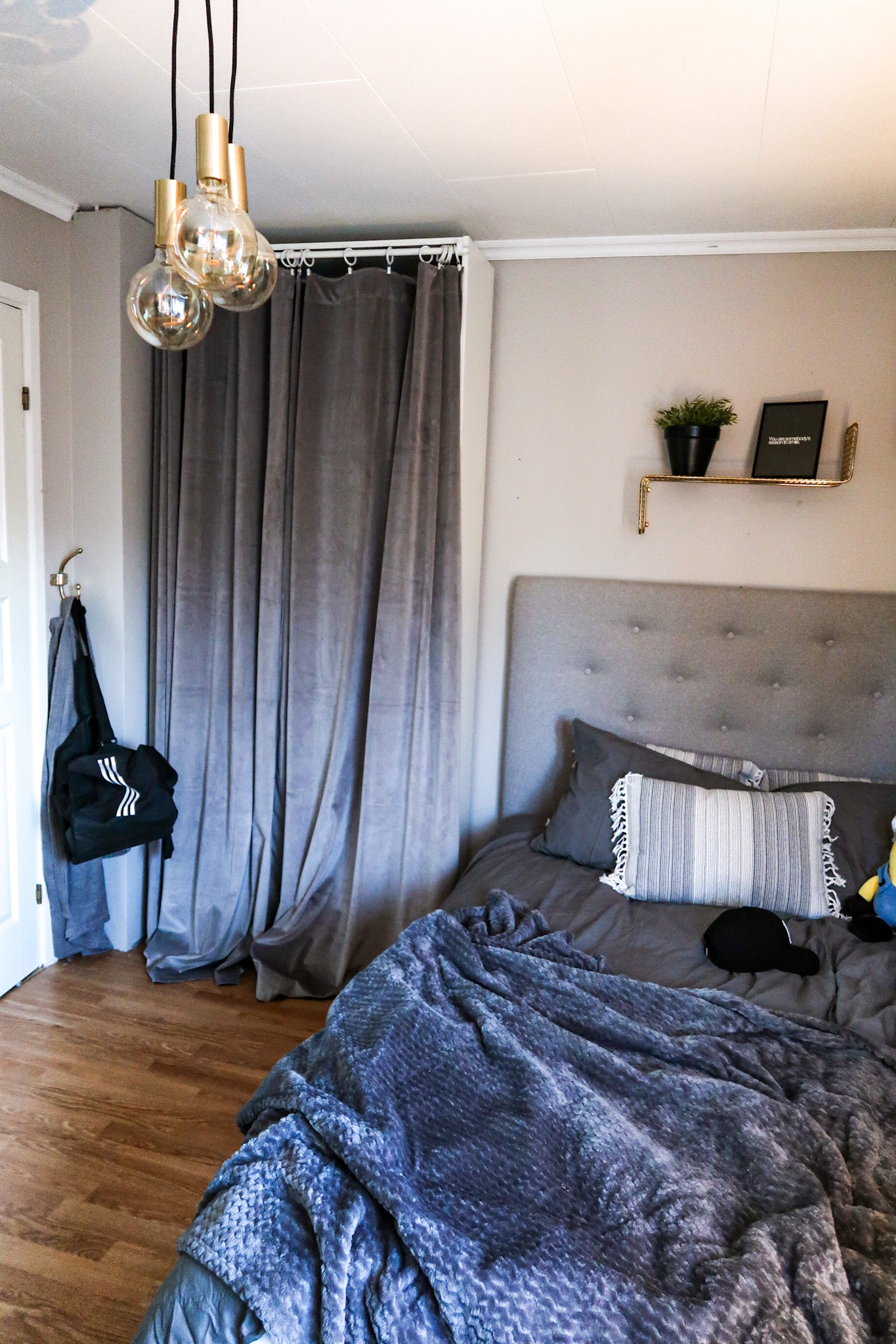 Sänggavel HÄR // Vägghylla Mässing HÄR // Sammetsgardiner för garderob HÄR // Väggkrok Mio // Kuddar HÄR // Påslakanset Mio // Taklampor Clas Ohlson // Vägghylla i trä // Vägghylla i ek Clas Ohlson // Ledbelysning vid taket HÄR
