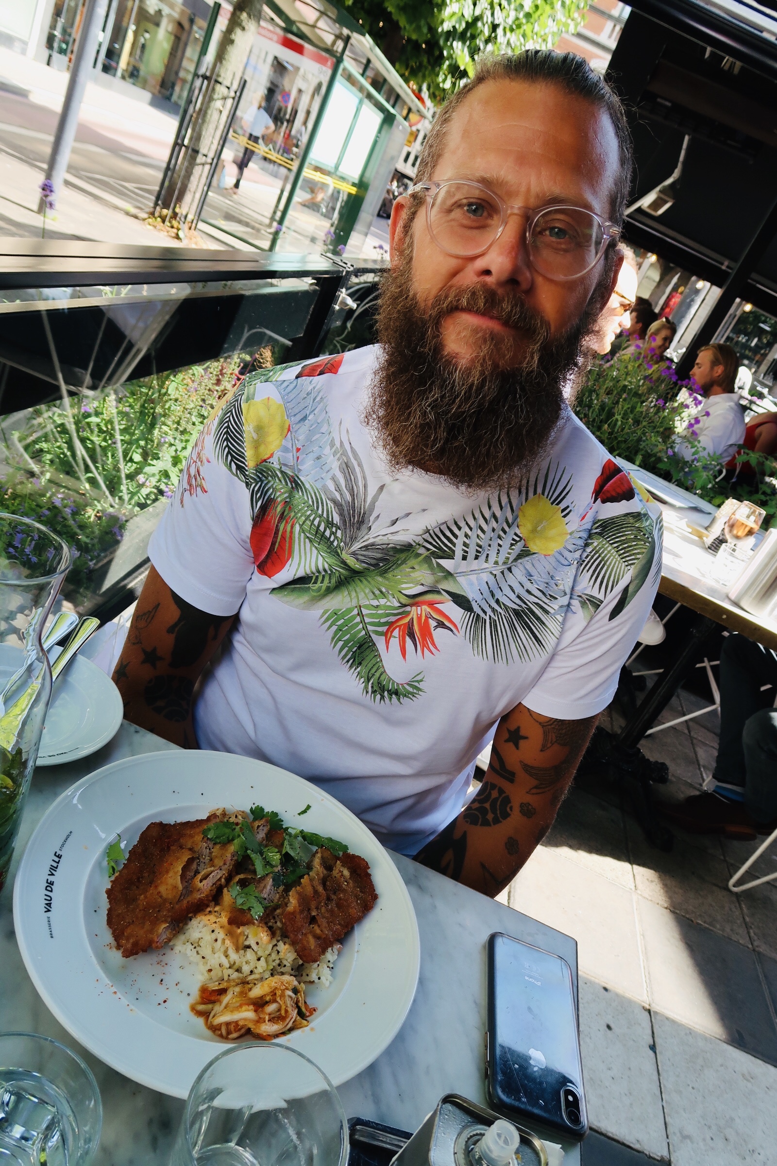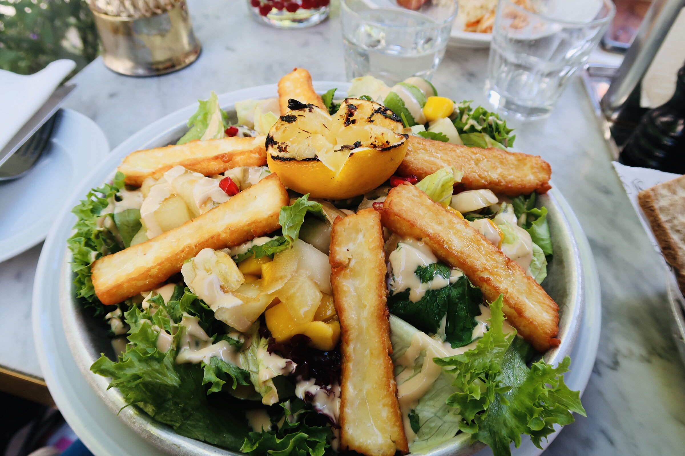 Tony åt kalvschnitzel och tyckte den också var supergod! Men om vi ska prata mer om halloumiplateaun så är den bland det godaste jag ätit. Den är liksom perfekt. Så mycket frukt och grönt med en dressing som är ”to die for” och så halloumi uppepå. Åker du dit nångång så testa den!