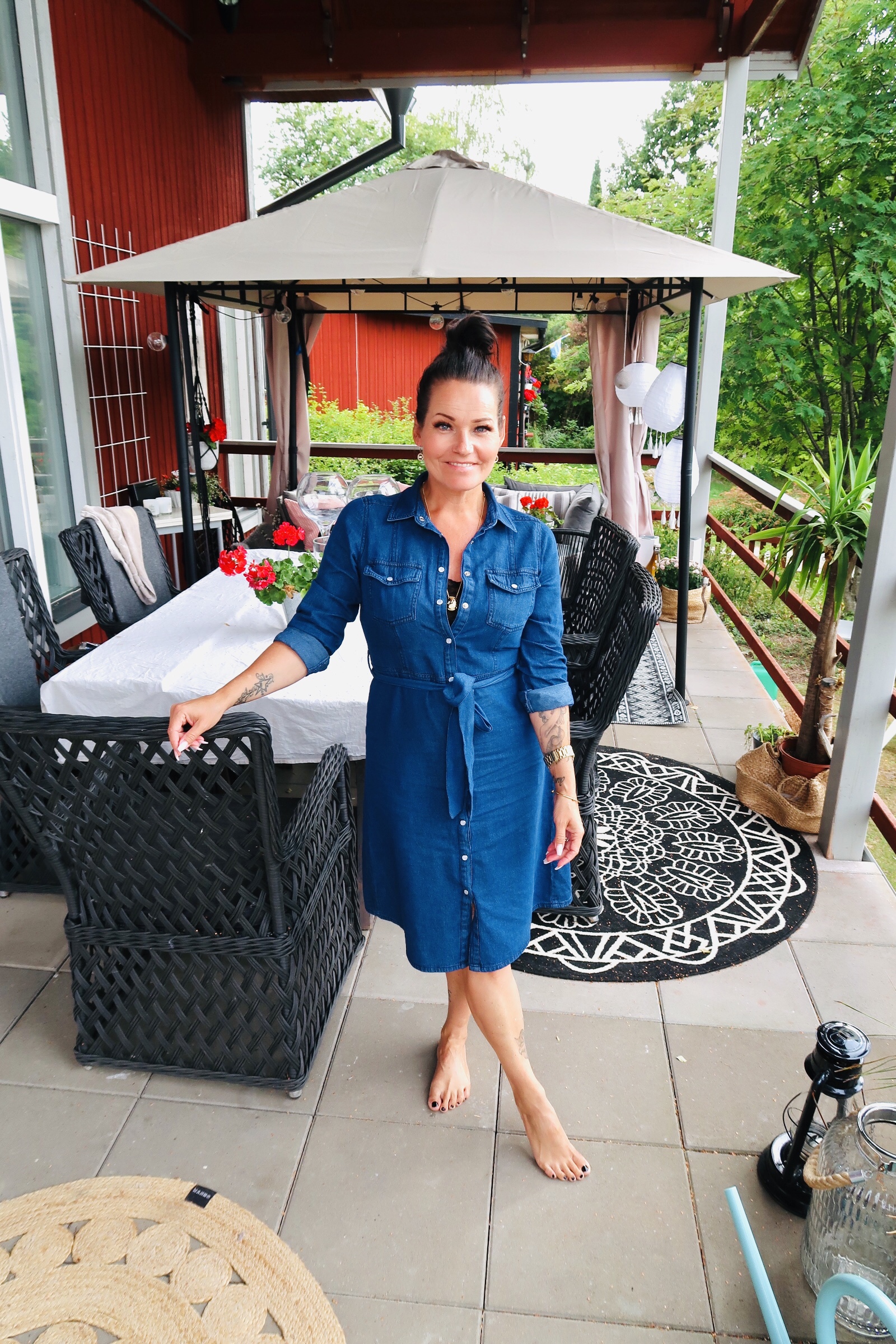 Nina! Var har ni köpt era snygga svarta korgstolar, de som du står jämte när du visar jeansklänningen😍