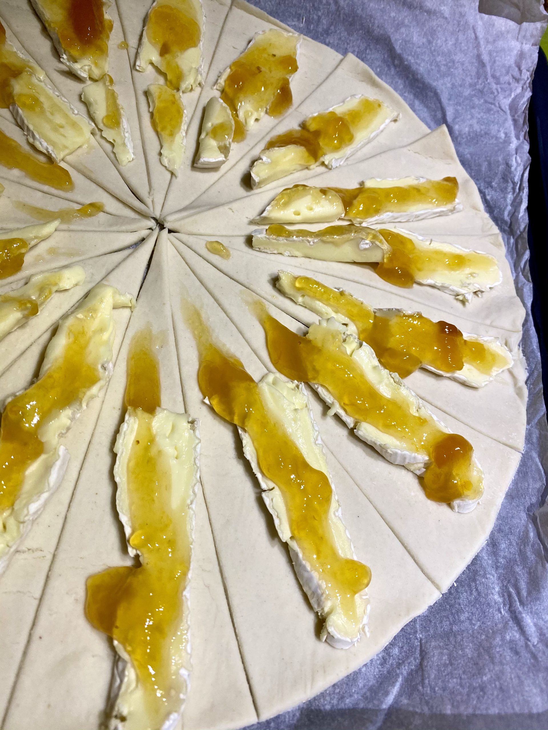 Som sagt, sedan körde jag med pizzaslizer och delade upp smördegsplattan som på bilden. Sen en Brieost som jag skar bitar ur och la på, efter det på med aprikosmarmelad och sedan in i ugnen på 200 grader i ca 20 min. Mot slutet täckte jag den med folie så inte osten skulle bli för mörk.