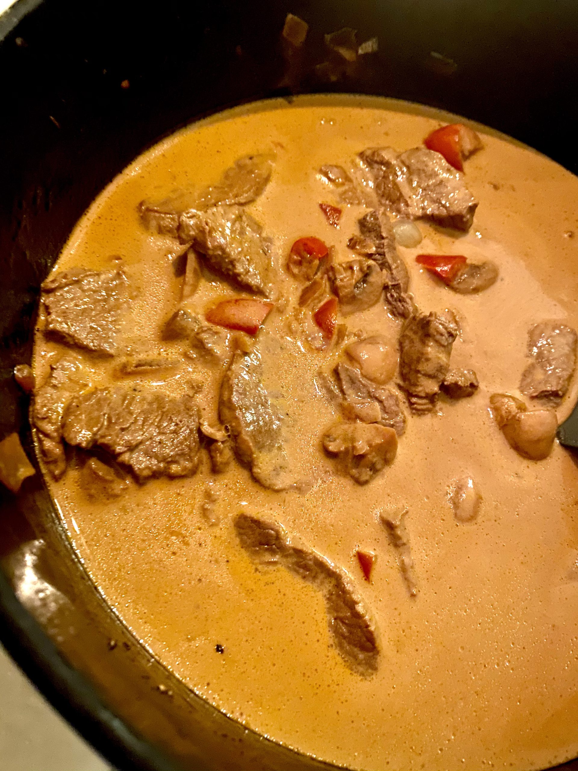 5) Stek sedan köttet på hög värme i ca 45 sek- 1 min på varje sida, ta av från värmen och lägg i en skål. När det är ca 3-4 min kvar på grytan att puttra lägger du i köttet och låter det puttra med. Smaka av med salt och peppar. Sedan är det klart! Vi åt det med ris och det var såååå gott.