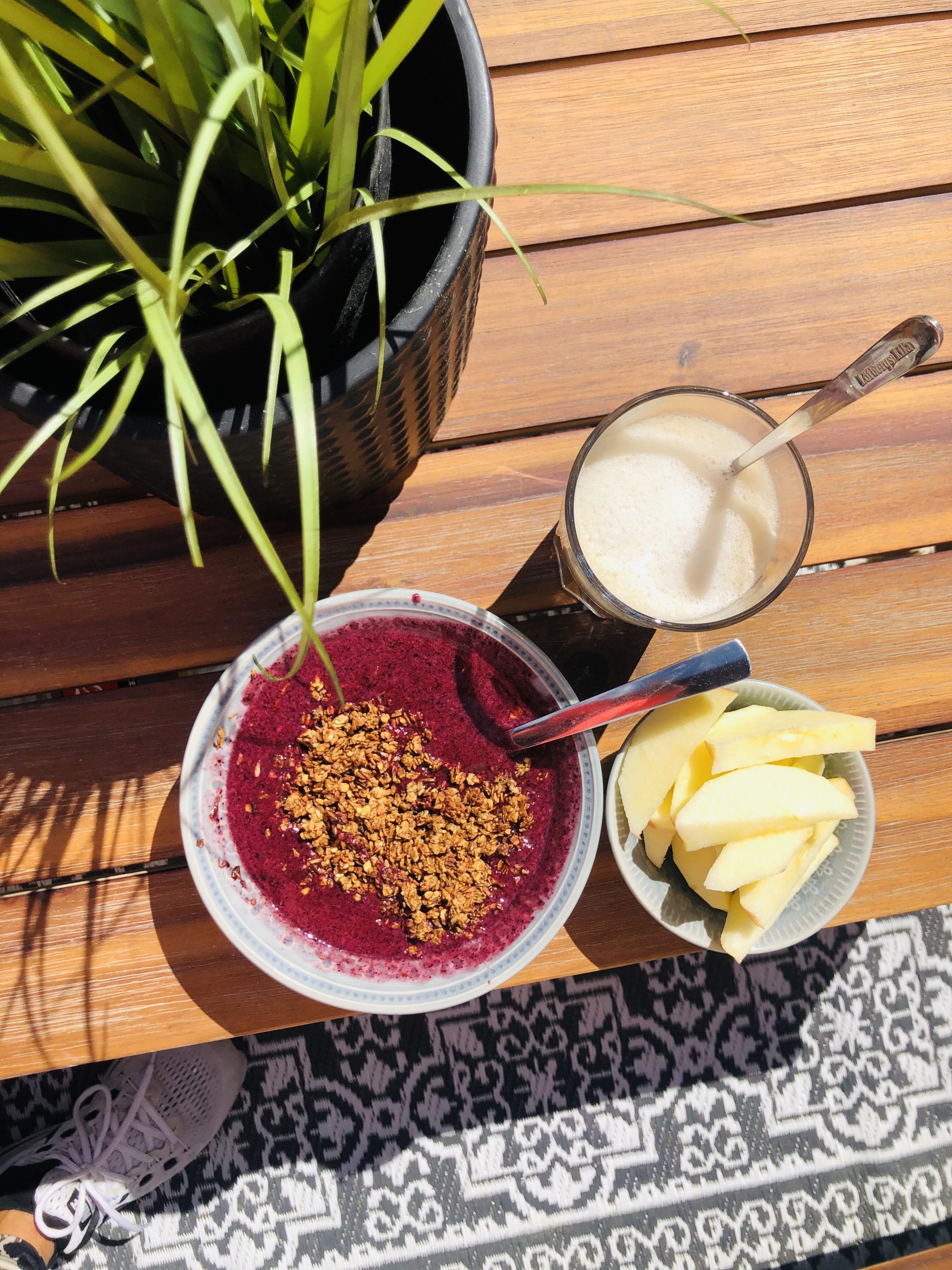 Här har ni mitt frukostmys. Nästan bara frukt och bär denna morgon. En smoothiebowl med hemmagjord granola och i själva smoothien är det 3 bananer och 1,5 dl blåbär och vatten. Ett skalat äpple och så kaffe med havremjölk. Mums!