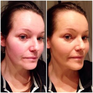 Ja sån här skillnad blir det i mitt ansikte när jag kör foundation. Som ni ser så neutraliserar den de röda tonerna och jämnar dessutom till.