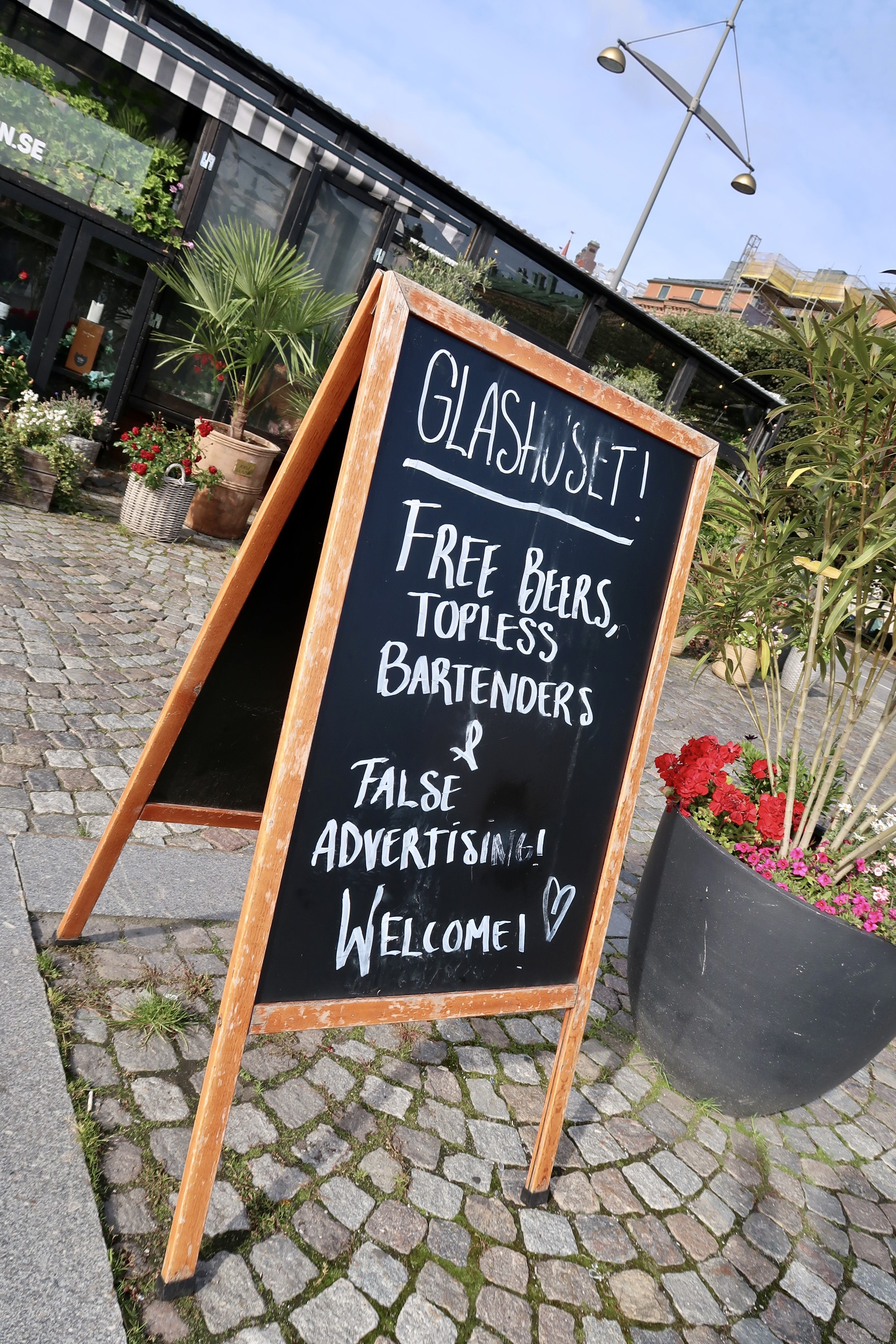 Fina Glashuset. Ser ni trottoarprataren? Toppless bartenders…. och false advertising. 🤣 Restaurangen ligger så fint vid vattnet, älskar också inredningen därinne. Tips om ni vill gå på mysig restaurang.