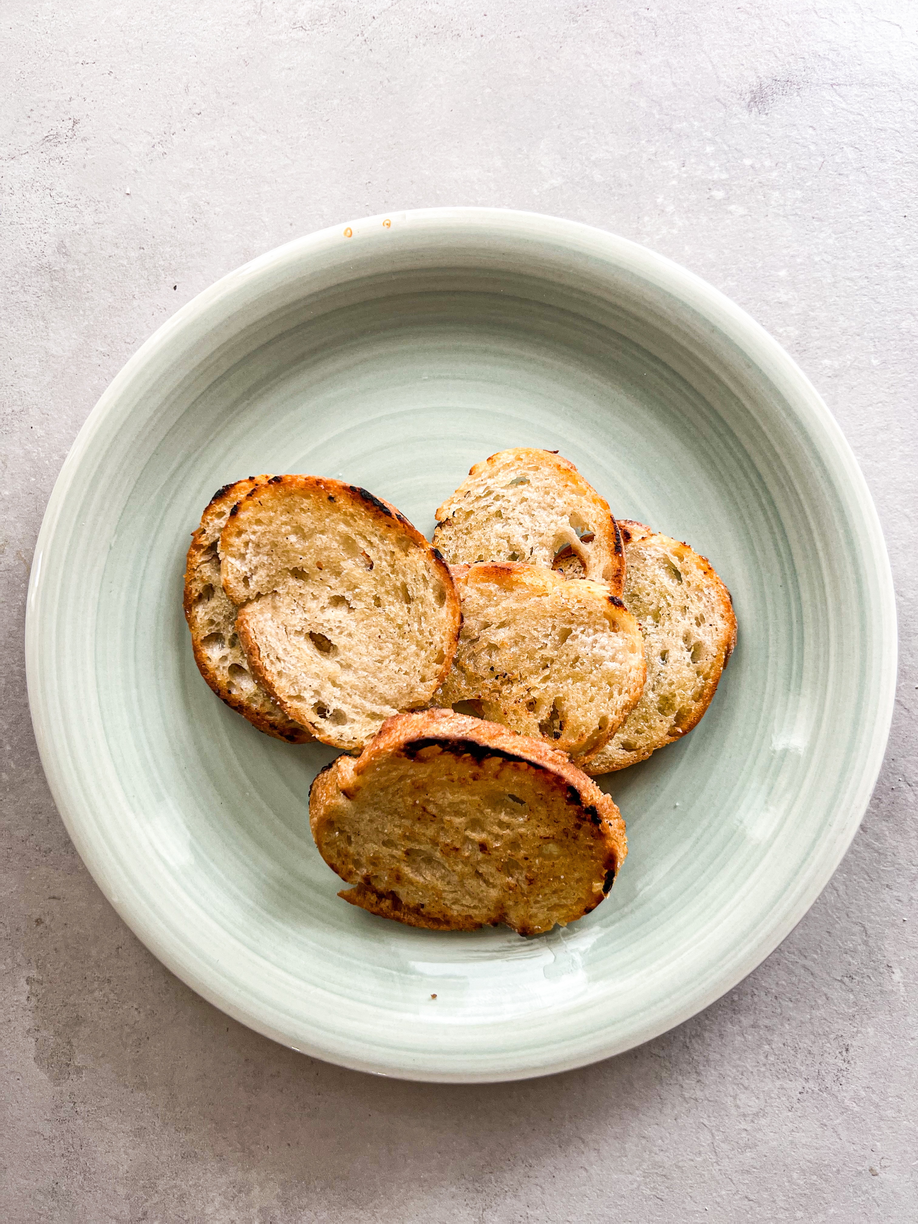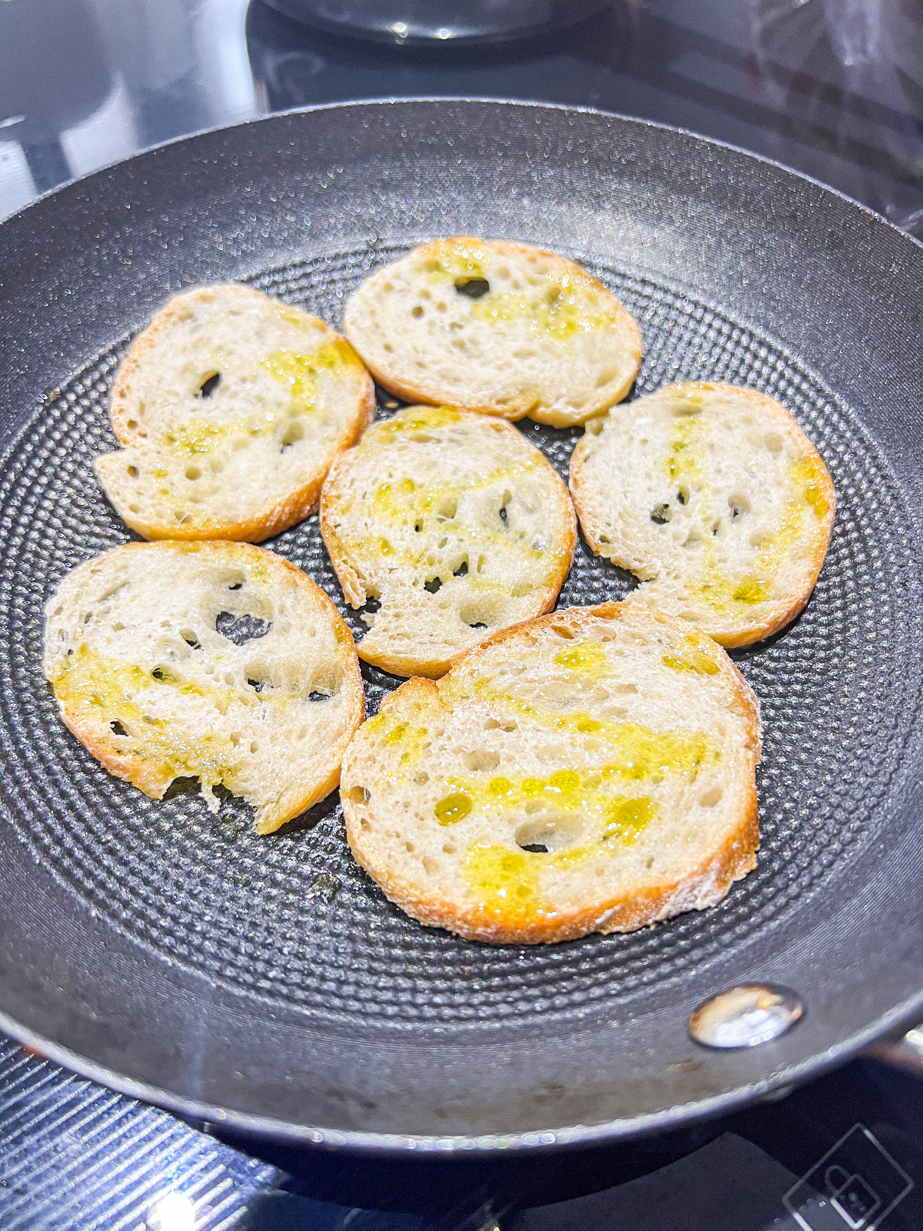 Skiva upp det. I stekpannan med det och sen ringlar du god olivolja över. Låt rosta på medelvärme, håll koll bara så du inte bränner det. Strö på lite flingsalt sen är det klart.