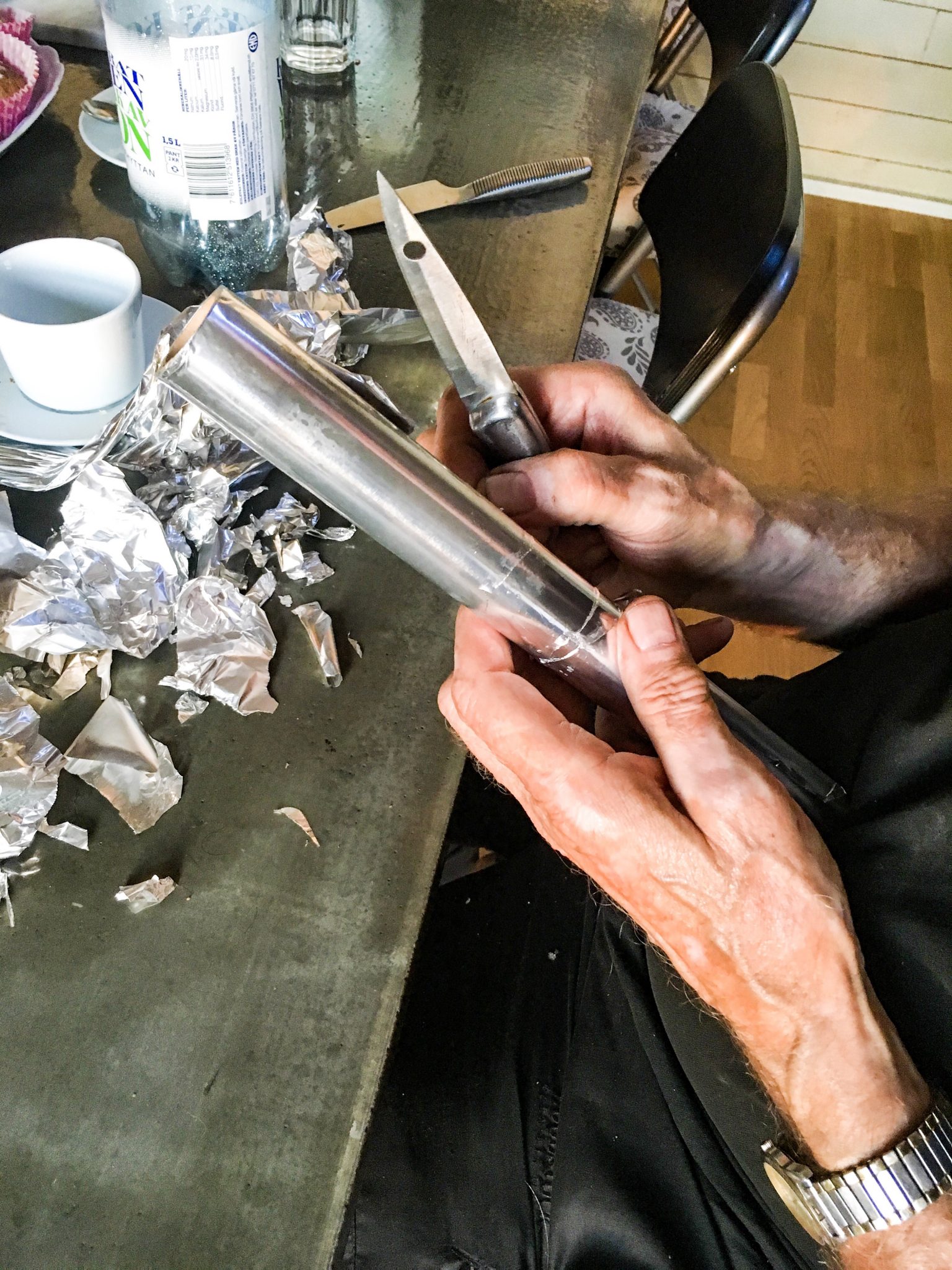Pappa fick det fina uppdraget att reda ut en folierulle som tappat det totalt. Det hade dragits bitar ojämnt så det var som om halva rullen fattades. Men pappsen fixade det där faktiskt!