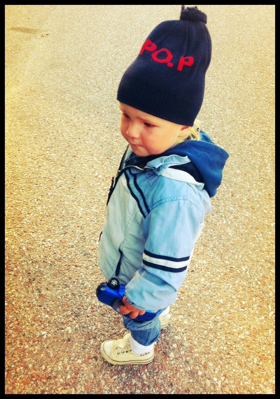 Sötisen i morse. Det var så pass kallt så PO.P mössan fick komma på. Den ska sitta lite sådär högt tycker Milobebis. Här var han lite ledsen dock, han fick ju inte köra vagnen till bilen. 🙁