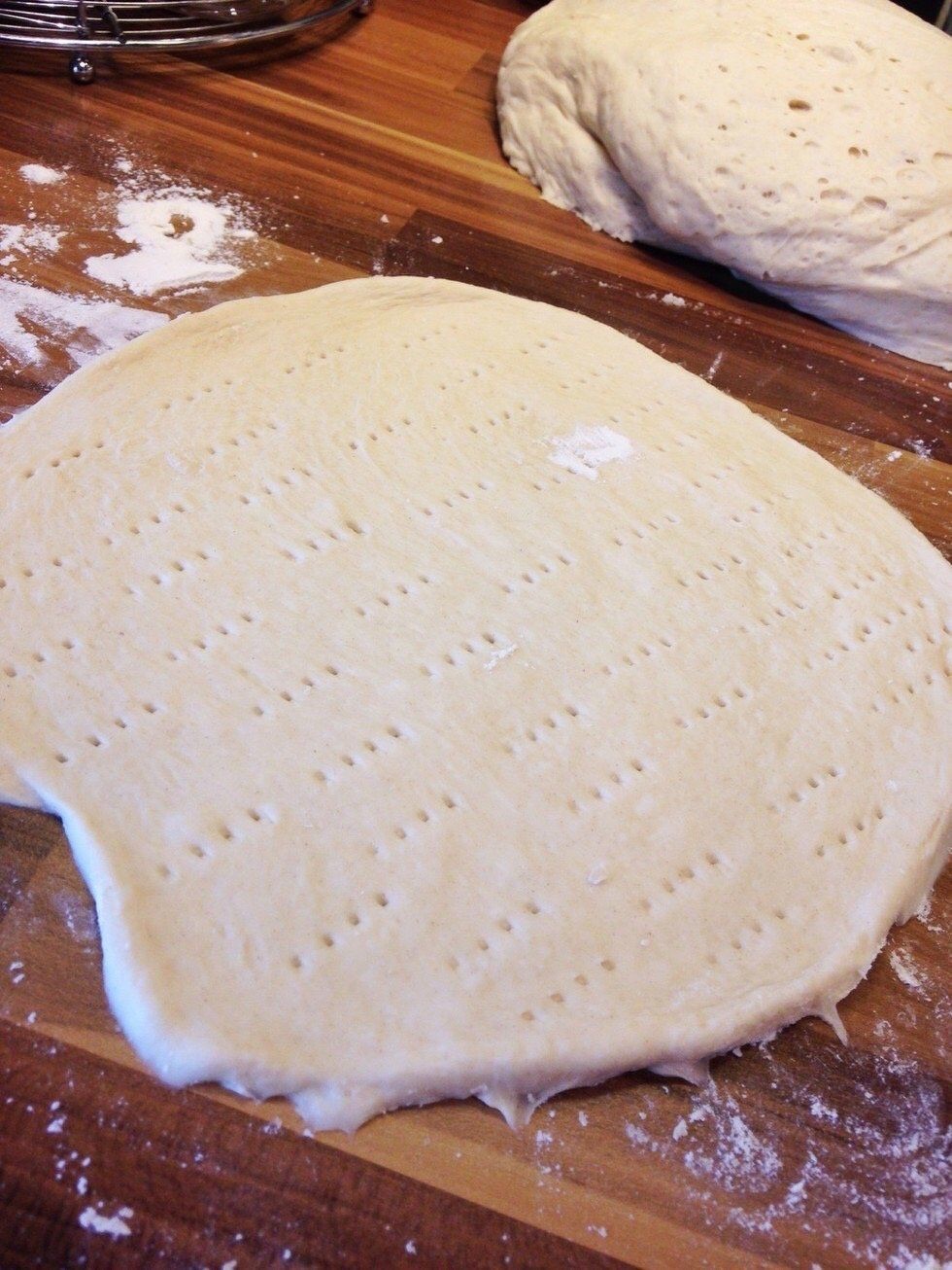 5) Dela sedan degen i 16 bitar. Kavla ut till runda plattor son är ganska så tunna. Nagga plattorna noga.