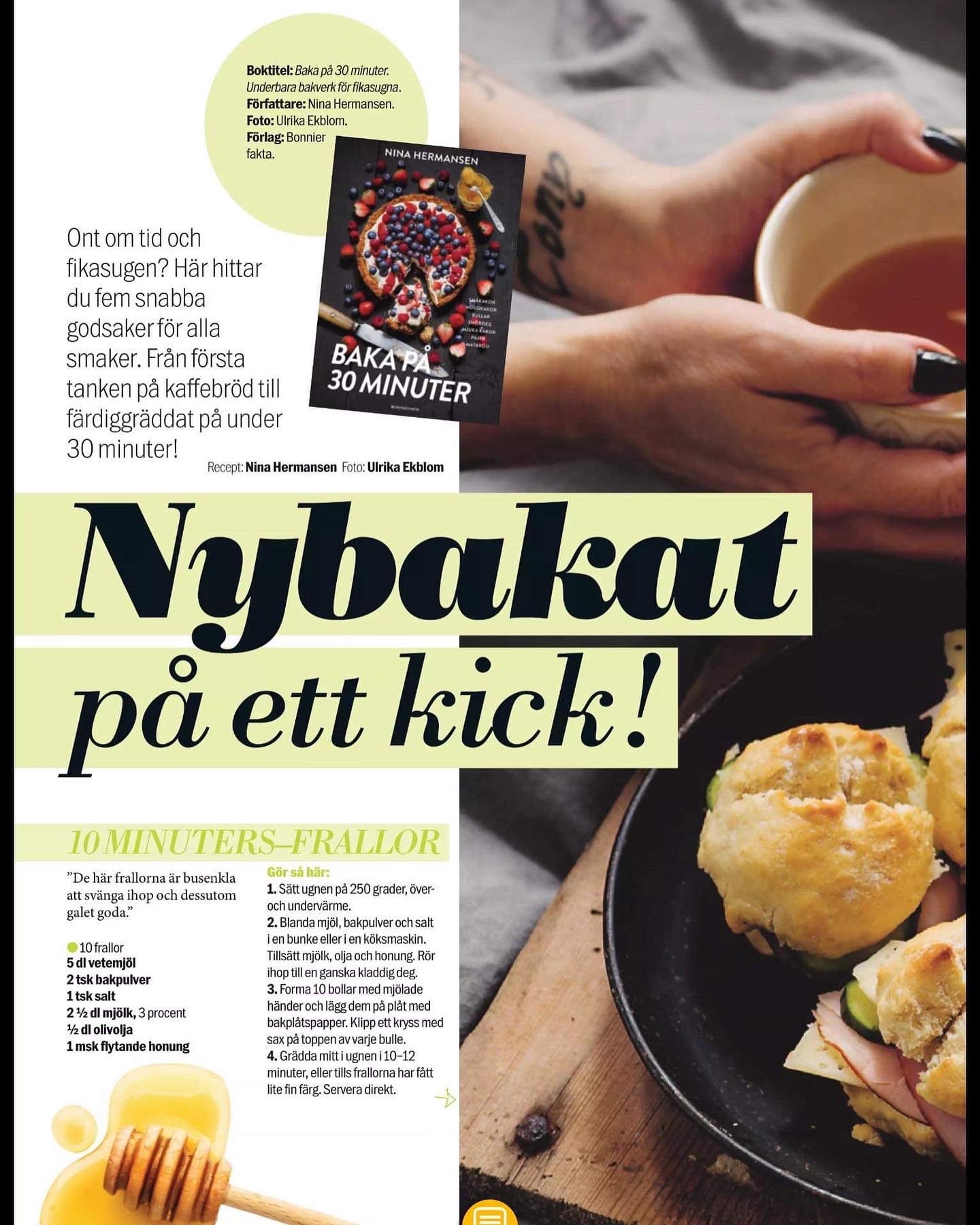 Vet inte om ni sett? Men igår var min bok ”Baka på 30 minuter” med i ett stort reportage i Söndagsbilagan. Åh, min lilla bebis. Det känns så fint varje gång jag ser att den lyfts såhär. Om du vill köpa den så hittar du den HÄR. Fylld med massor av recept på snabbakade och roliga recept. Att få spontangäster är inte längre ett problem med denna boken. Allt från pajer, småkakor, bullar, mjuka kakor till bröd.