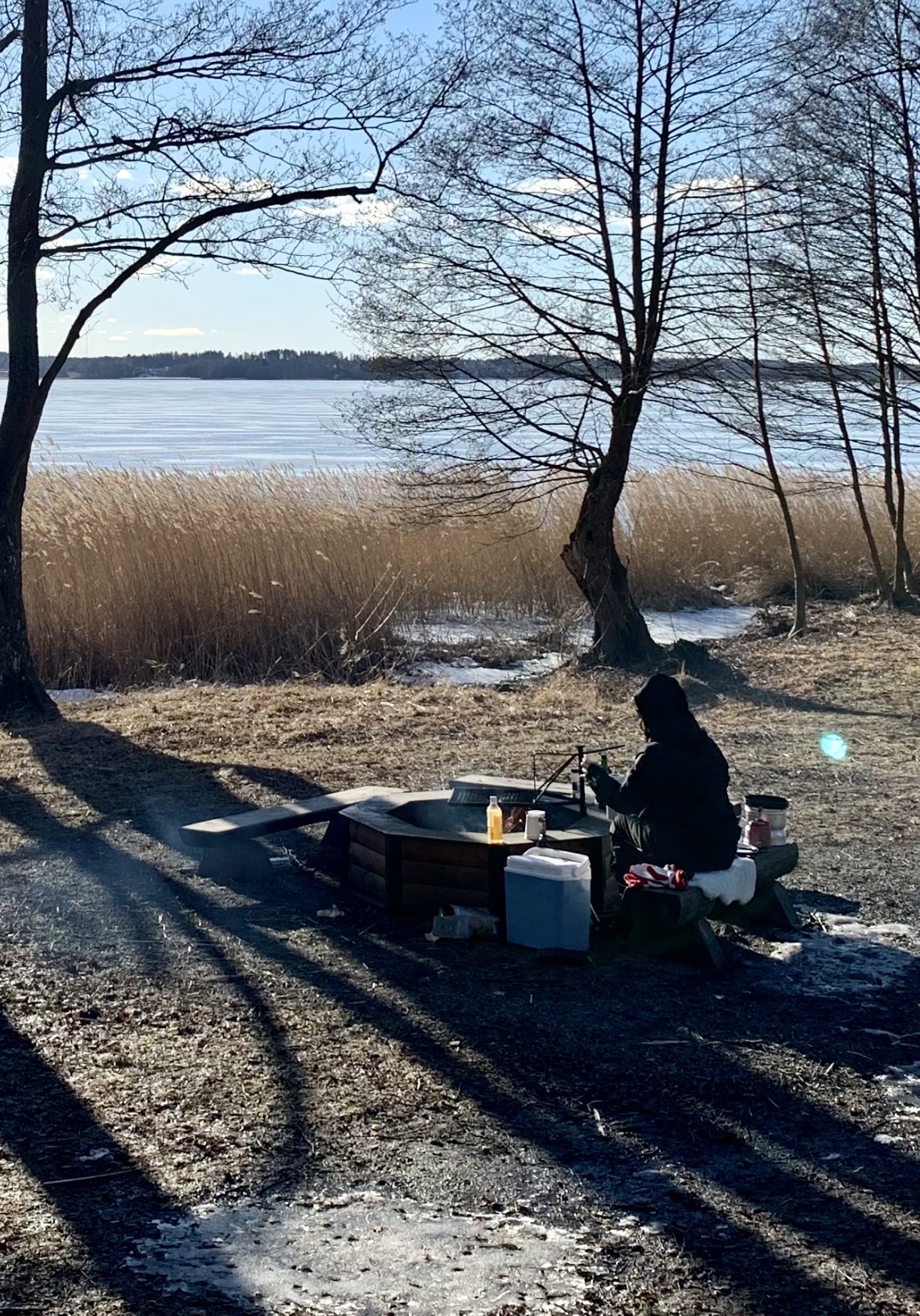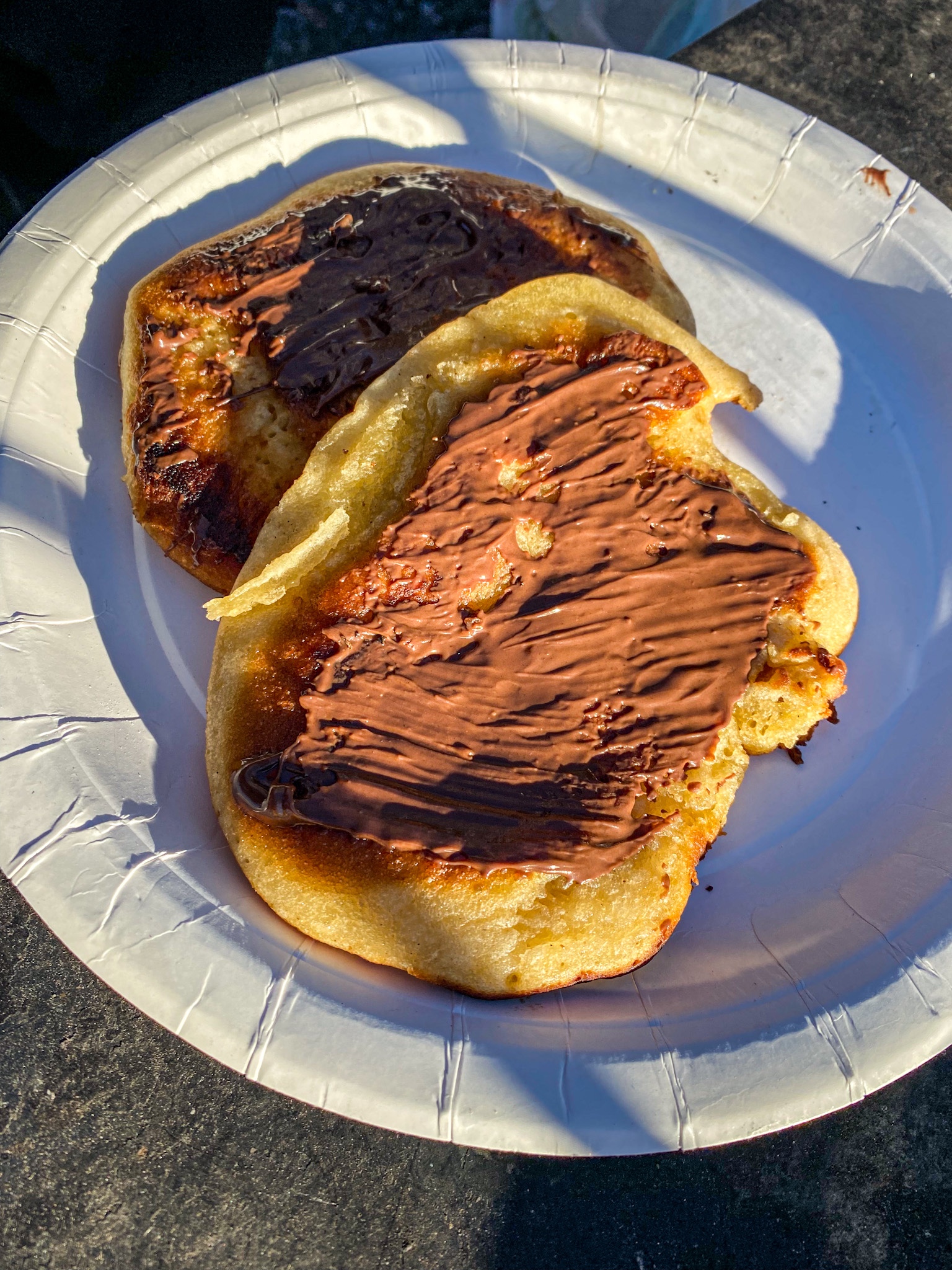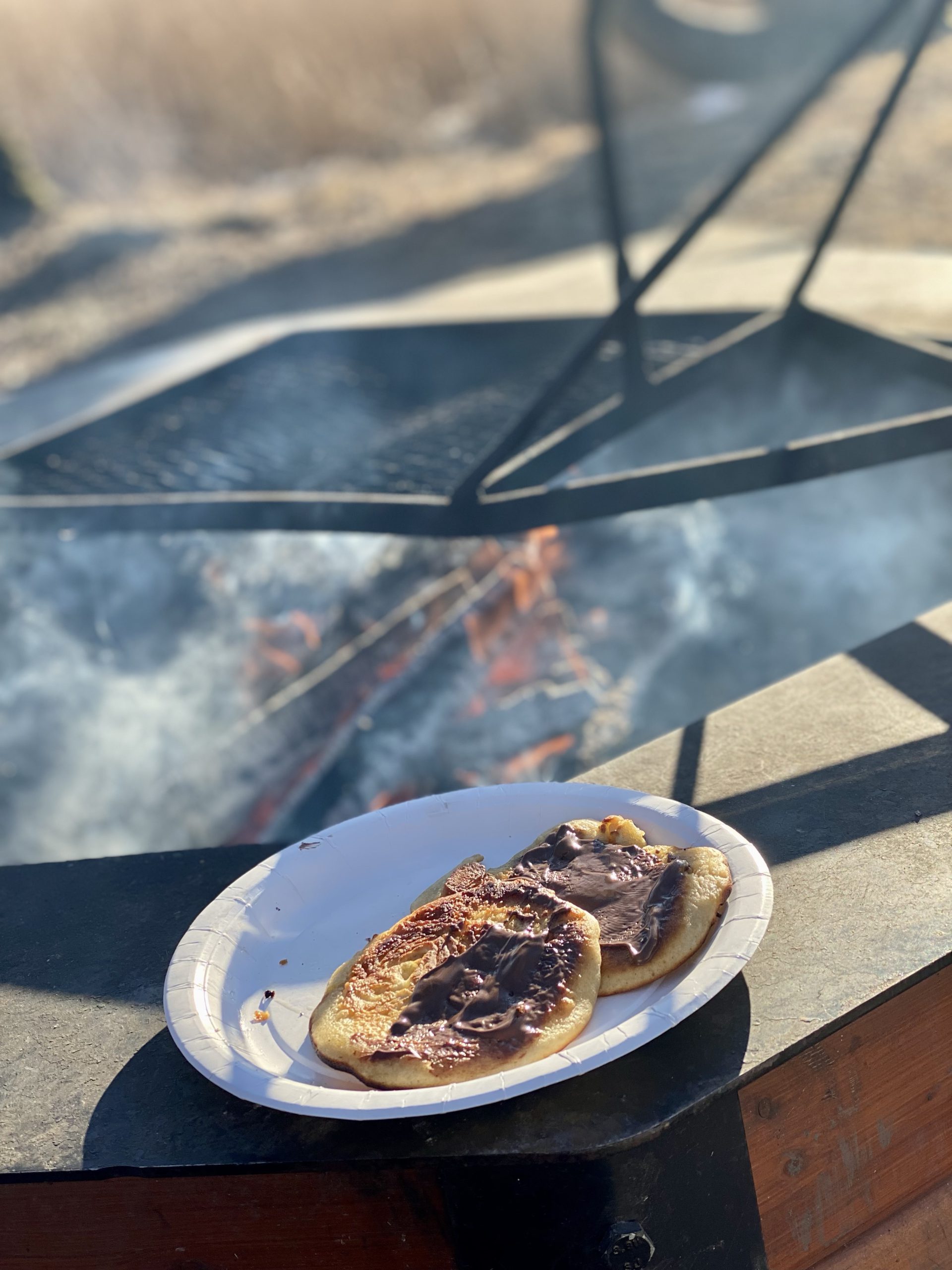 Tog med Nutella som vi bredde på dem med. Fasligt smarrigt, smakade en liten bit. Är ju allergisk mot hasselnötter och äter inte så mycket sånt mer än på lördagar just nu. 😀 Tog med vårt Trangiakök, det är verkligen helt perfekt att laga mat med och faktiskt också göra lite enklare efterrätter med. Älskar det där stormköket alltså.