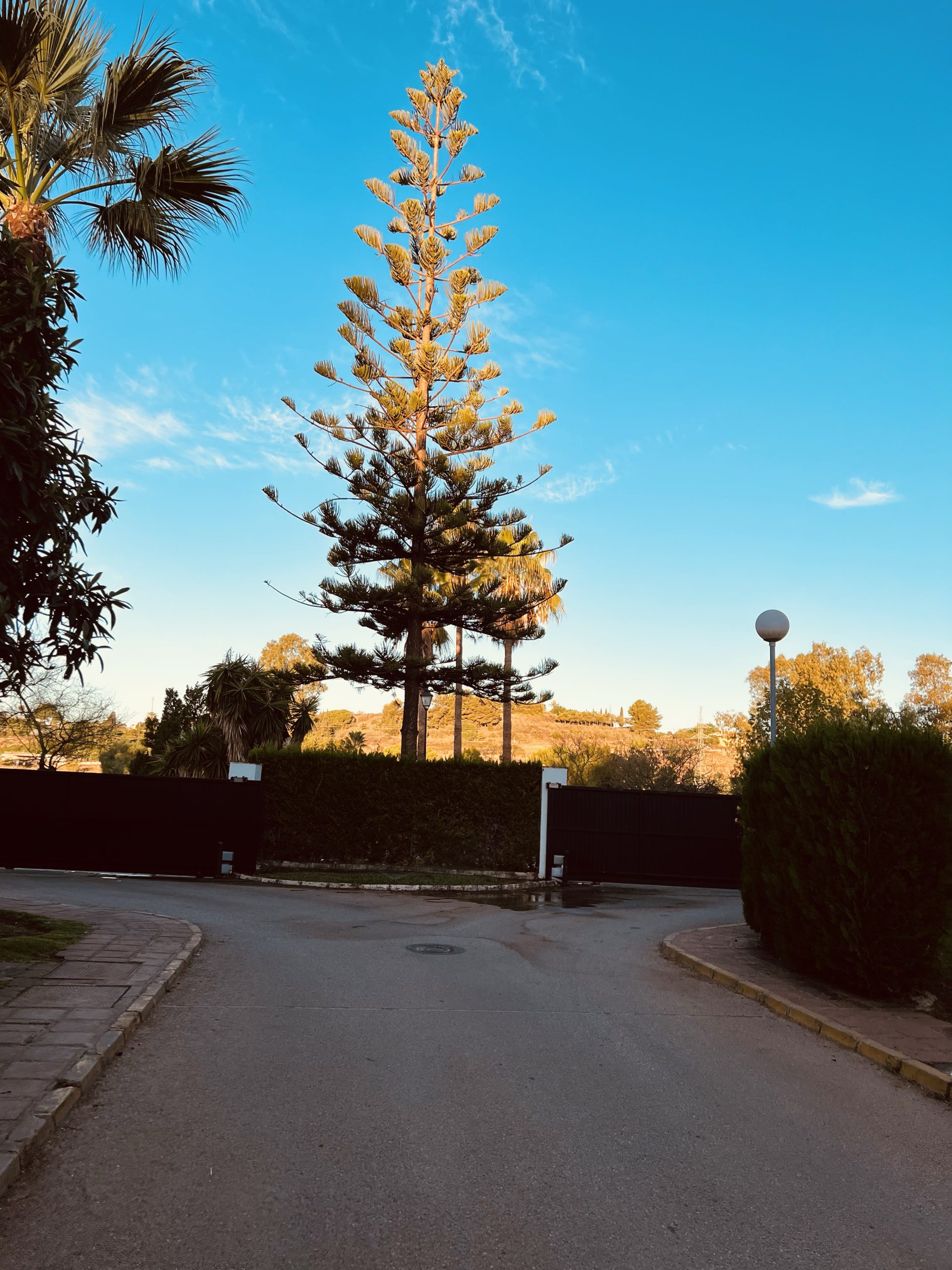 På väg till padelbanan när vi just kommit ut från vårt hus möts vi av detta. Älskar dessa magiska trädet som påminner om granar.