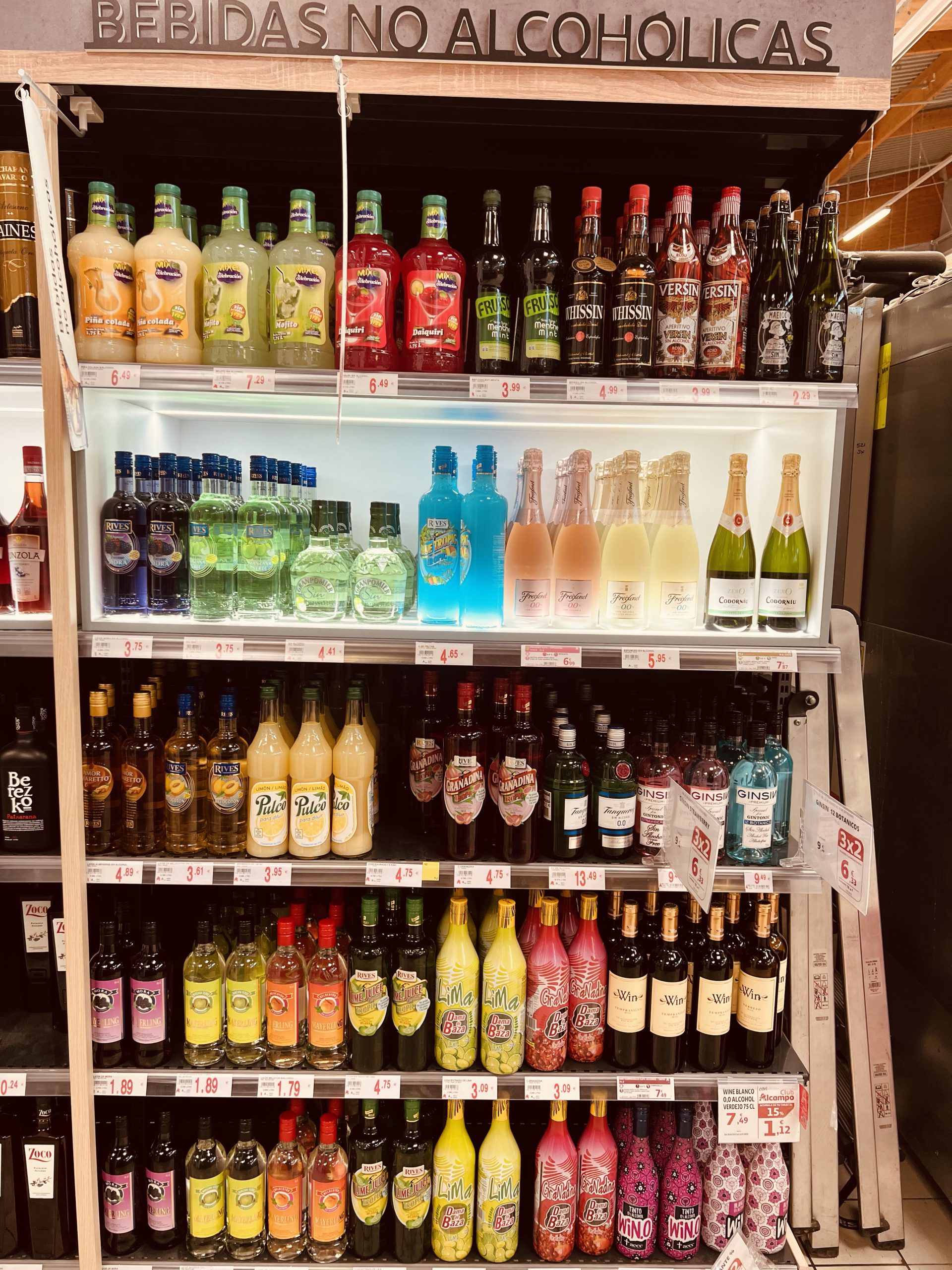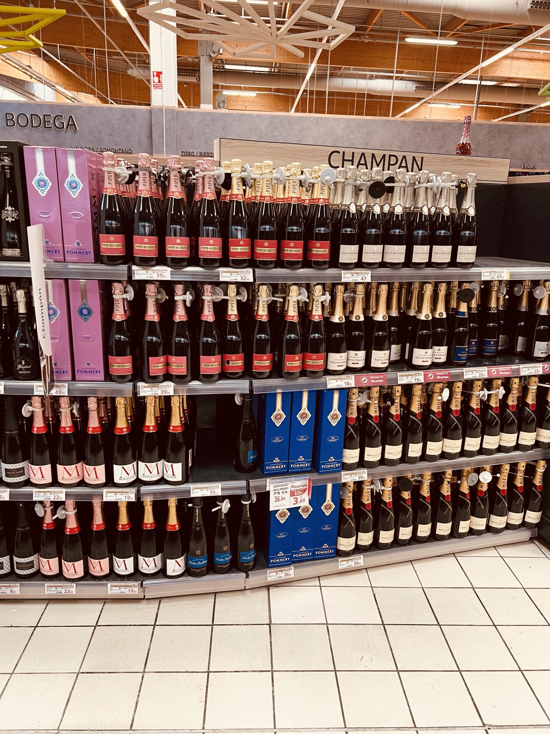 De gånger man känner för alkohol så finns det t.o.m. finbubbel. Så ovant att se att de står rakt upp och ned i affären, dock är finbubblet larmat. Här köper man fina röda viner för inga pengar, kostar en flarra 80 kr så är det riktigt dyrt. Annars ligger det på ca 20/30 kr flaskan. Då får du ett fint Merlot-vin.