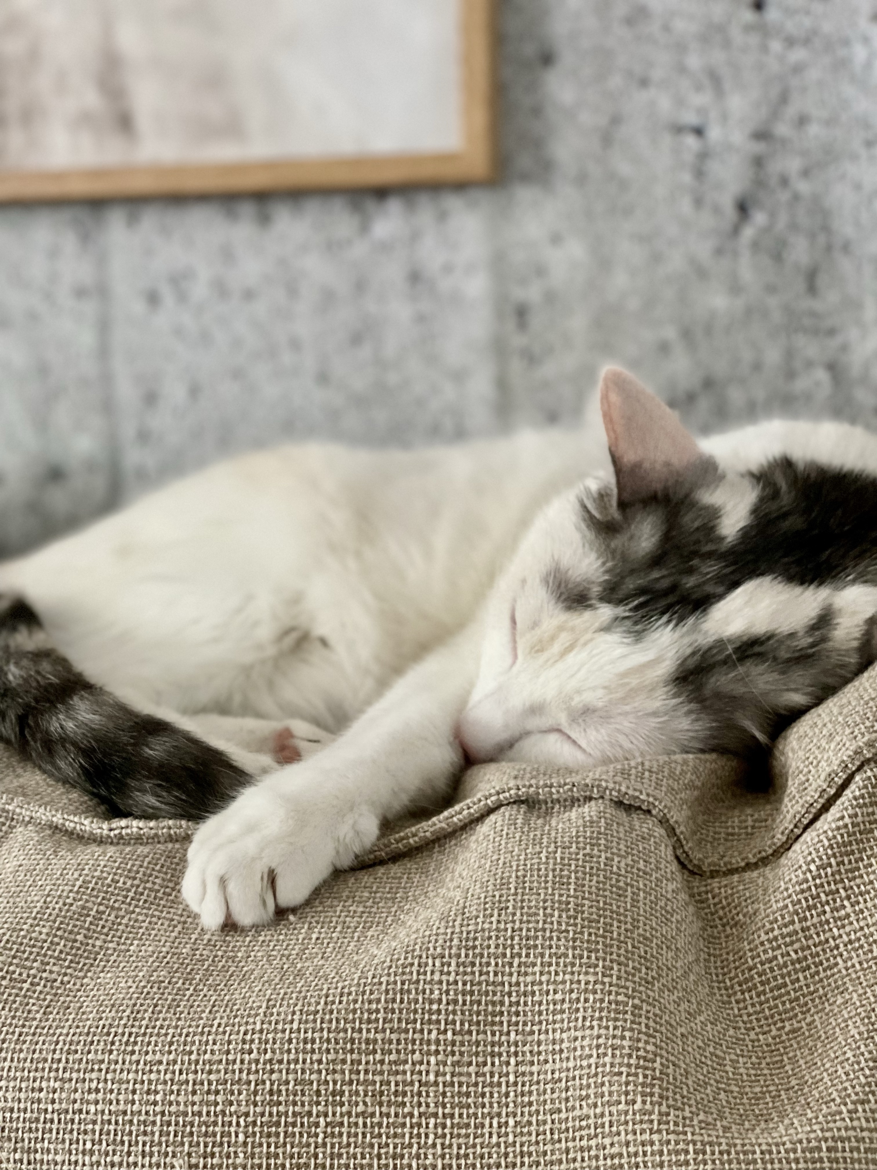 Nu ligger hon här bredvid mig på soffan på sin favoritplats. Uppepå ryggstödet på soffan är bästa platsen enligt henne.