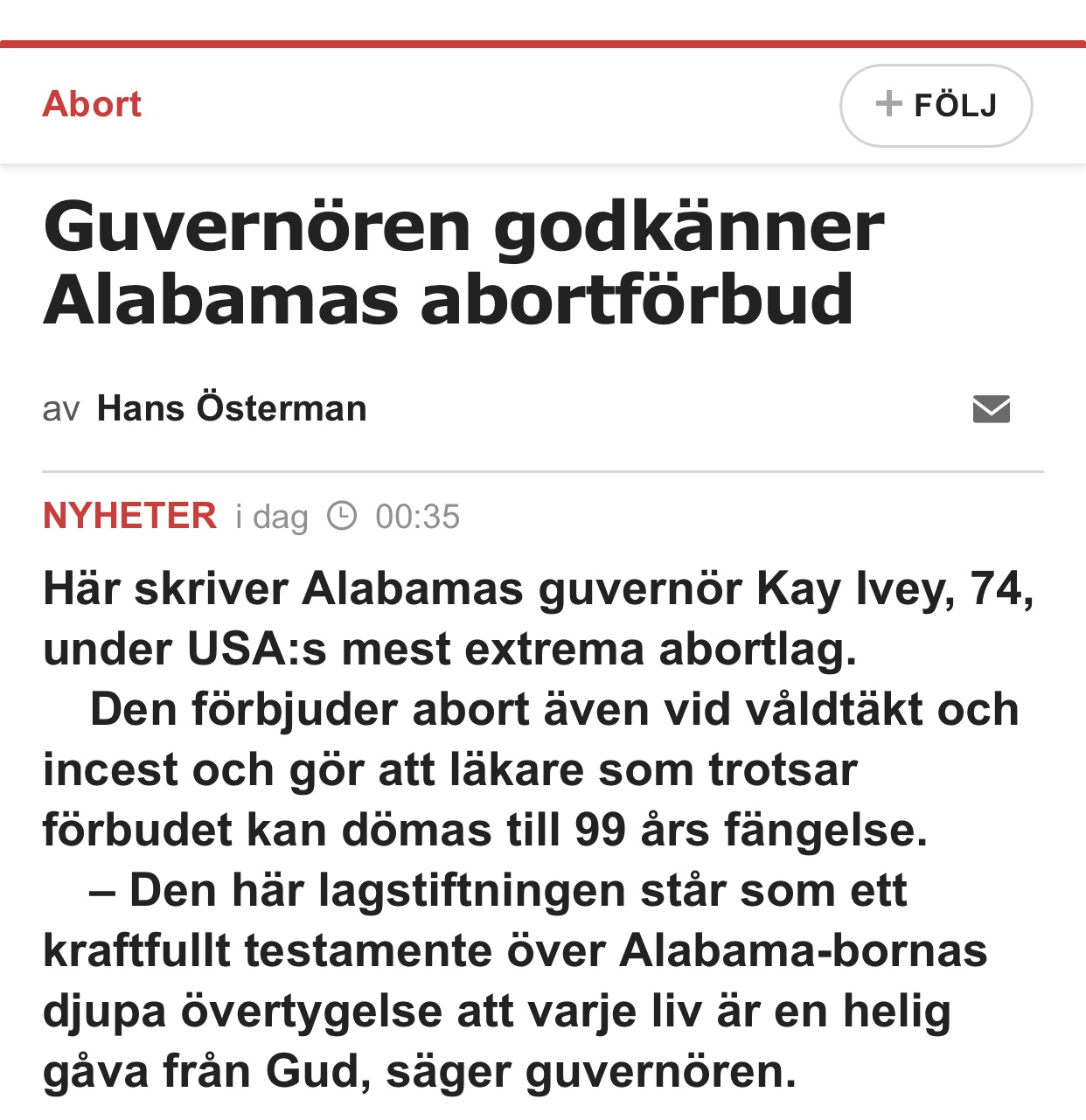 Håller med dig Nina, så fruktansvärt att det ens kan vara på agendan år 2019 Och att sen en 74 år gammal gubbe tar det beslutet är ju ännu värre, vad vet han liksom och hur har han ens rätt att få bestämma över kvinnors kroppar. Är det verkligen demokratiskt att ha såna lagar