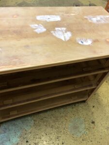 Efter en herrans massa gnoende för hand och första slipningen blev det såhär. Har nu skruvat bort alla beslag och slipat ytterligare en gång.