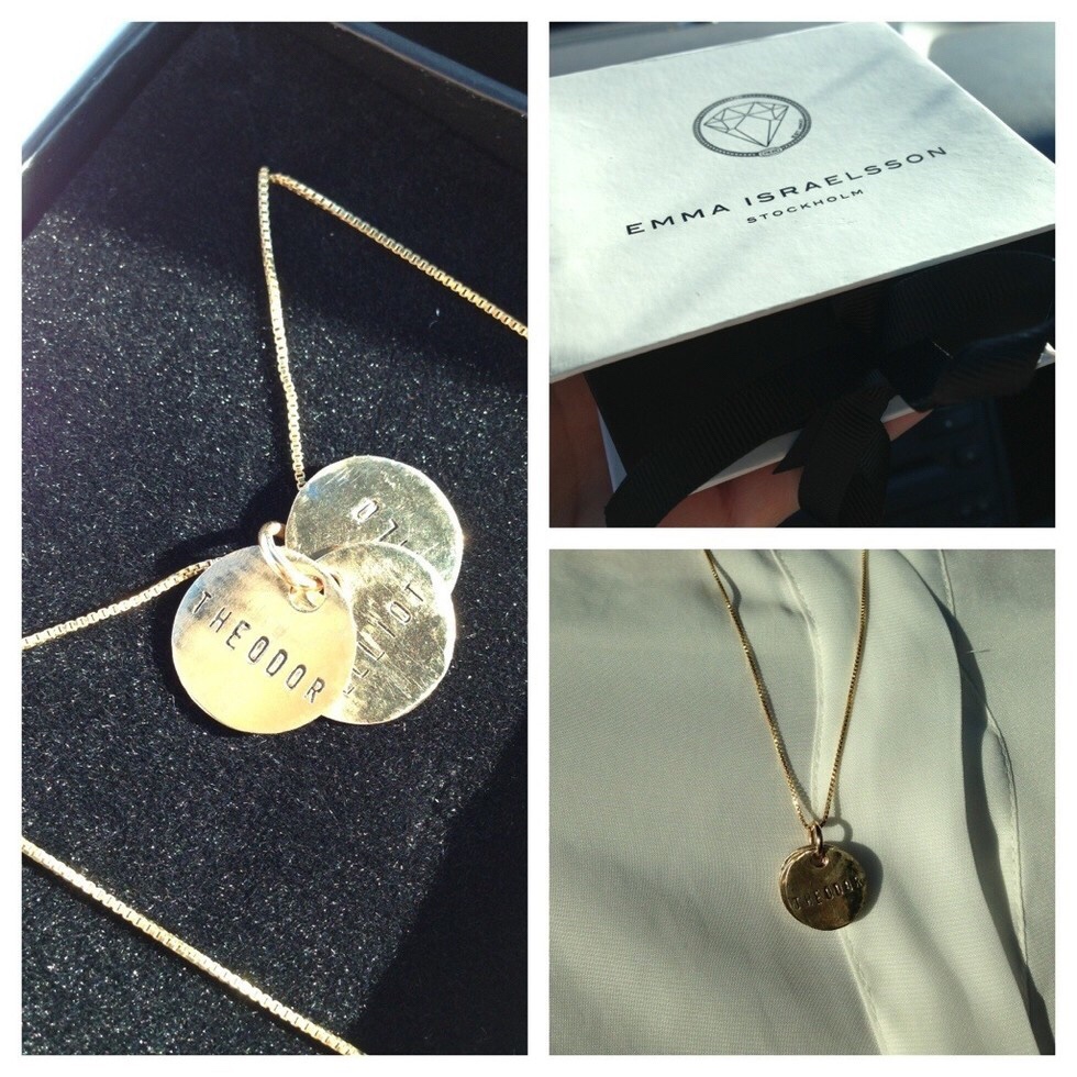 Något jag ofta har på mig är det här halsbandet från >>Emma Israelsson<<, där har jag barnens namn på. Sedan bär jag ju alltid >>armbandet<<från Emma Israelsson också.