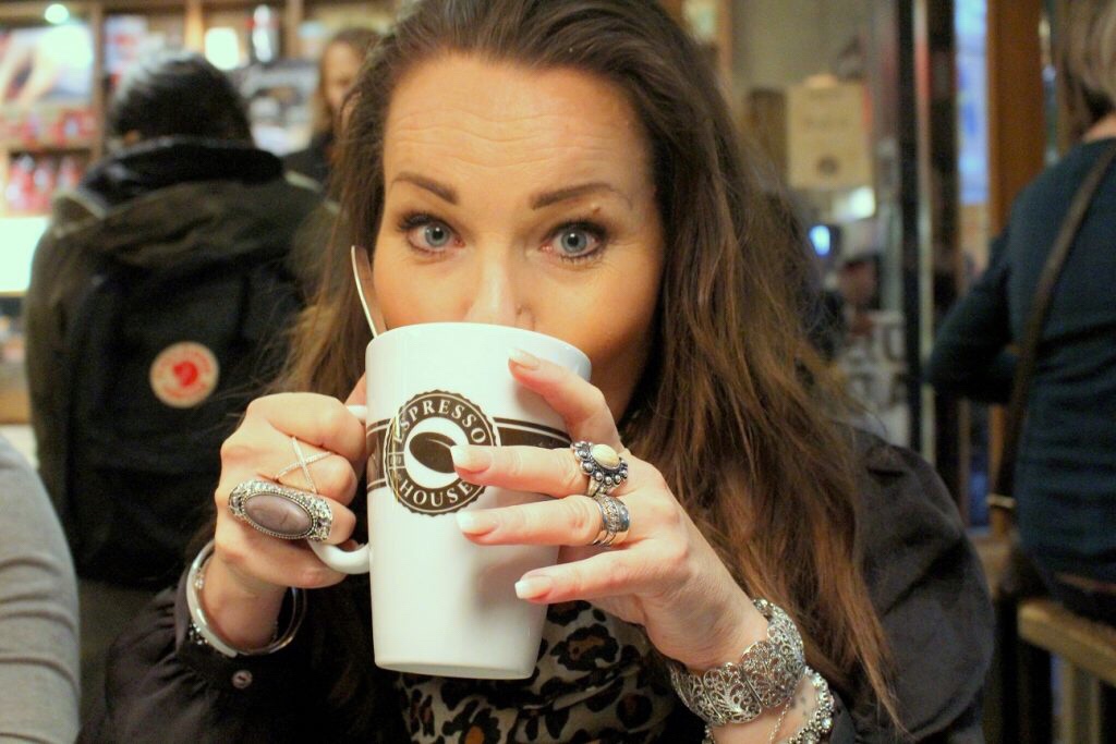 På väg till ett möte i Sthlm. Har på mig en lång kavaj i sweatshirt tyg med guldknappar.