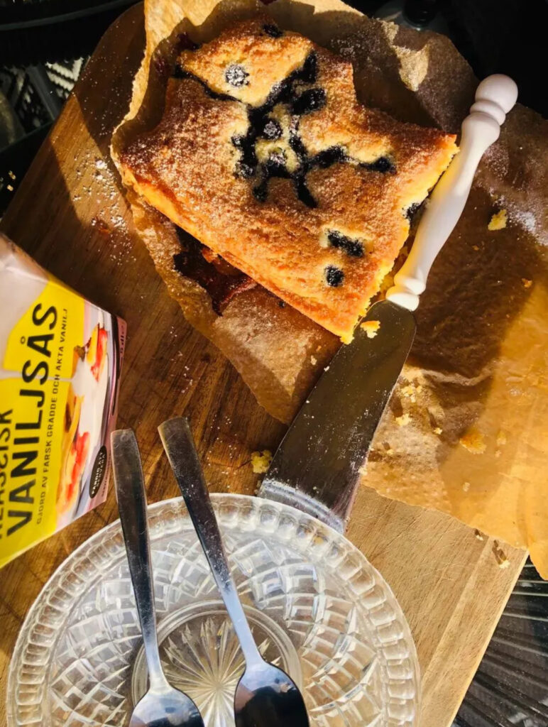 – när den snabba blåbärskakan (<klicka för recept) passar perfekt att servera ute på altanen bara sådär slängd på en skärbräda med vaniljsåsen i tetran.